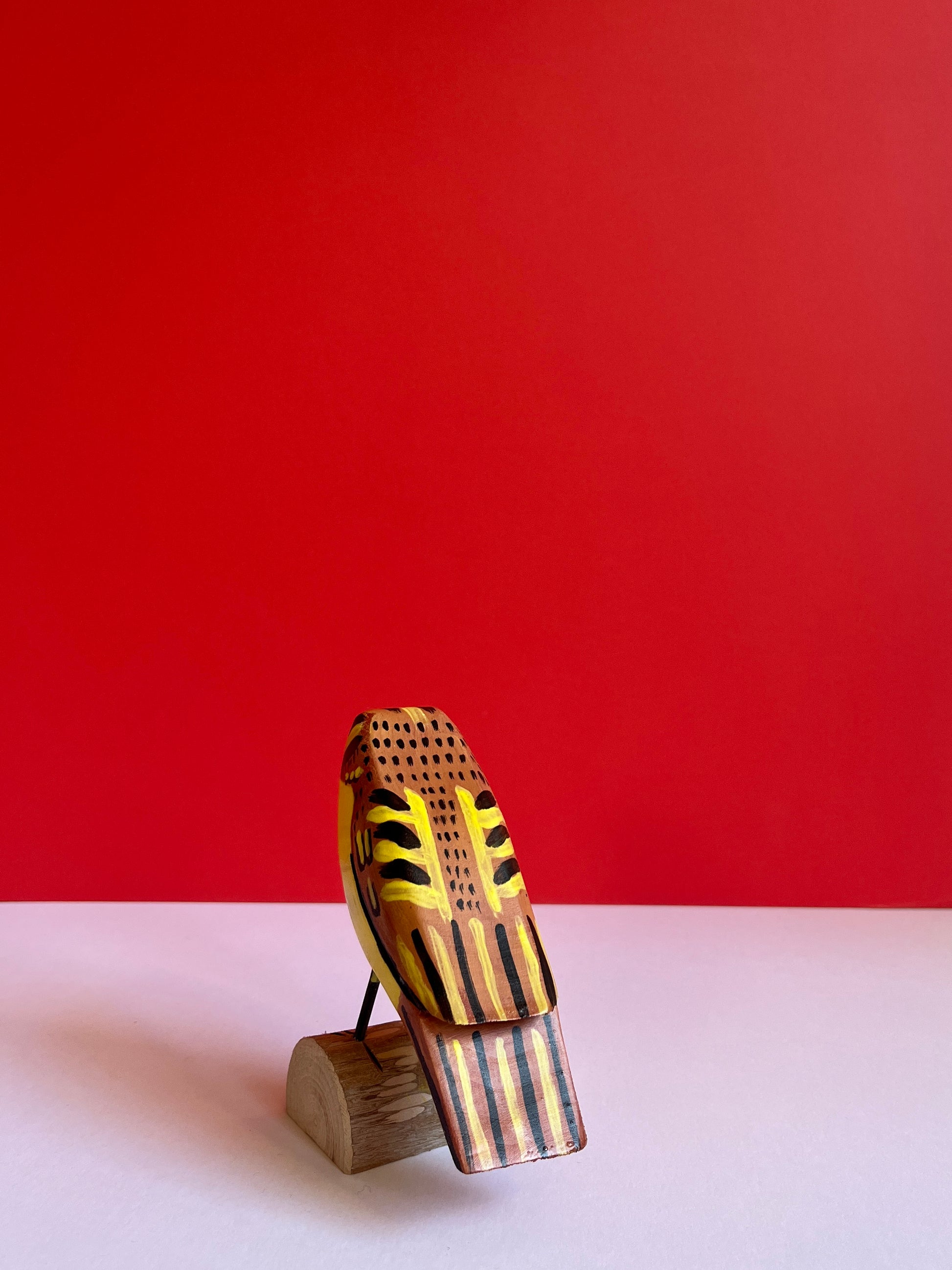 Beautiful hand carved and hand painted bird. Tadeusz, a retired forest ranger loves sharing stories about birds he saw in a forest. He is a self taught sculpturer, we love his geometric and modern style, colours and incredibly detailed hand painted patterns.