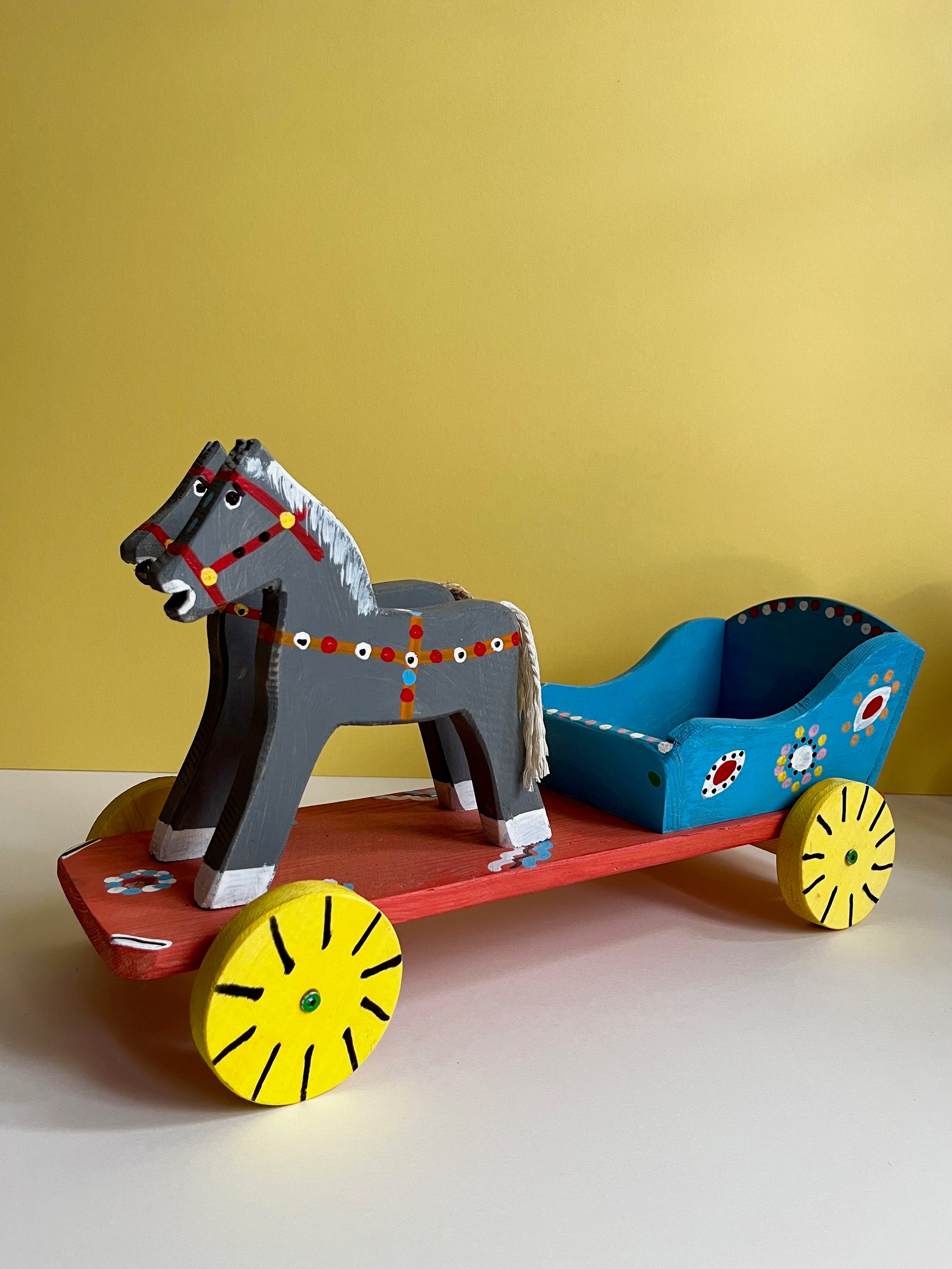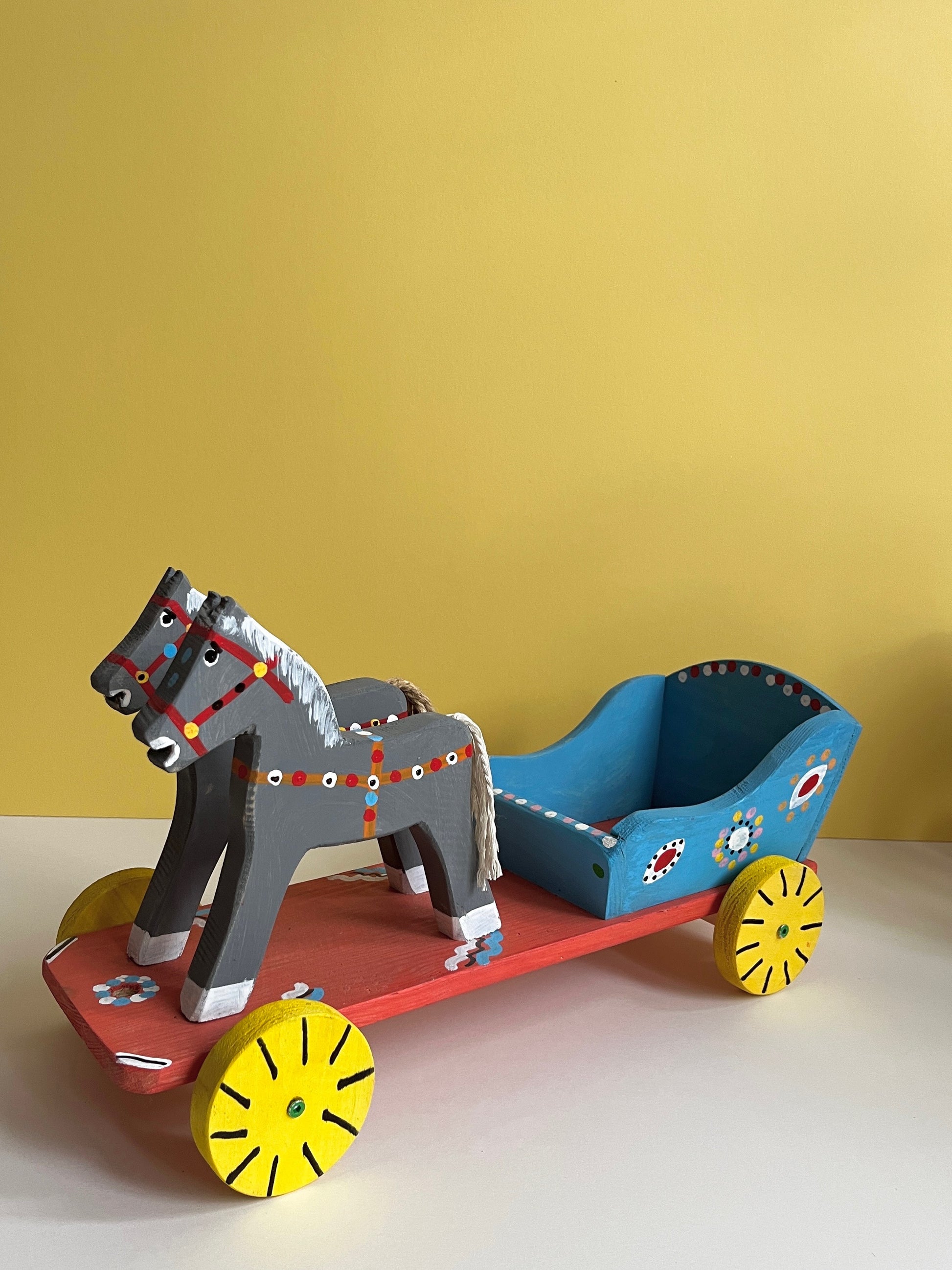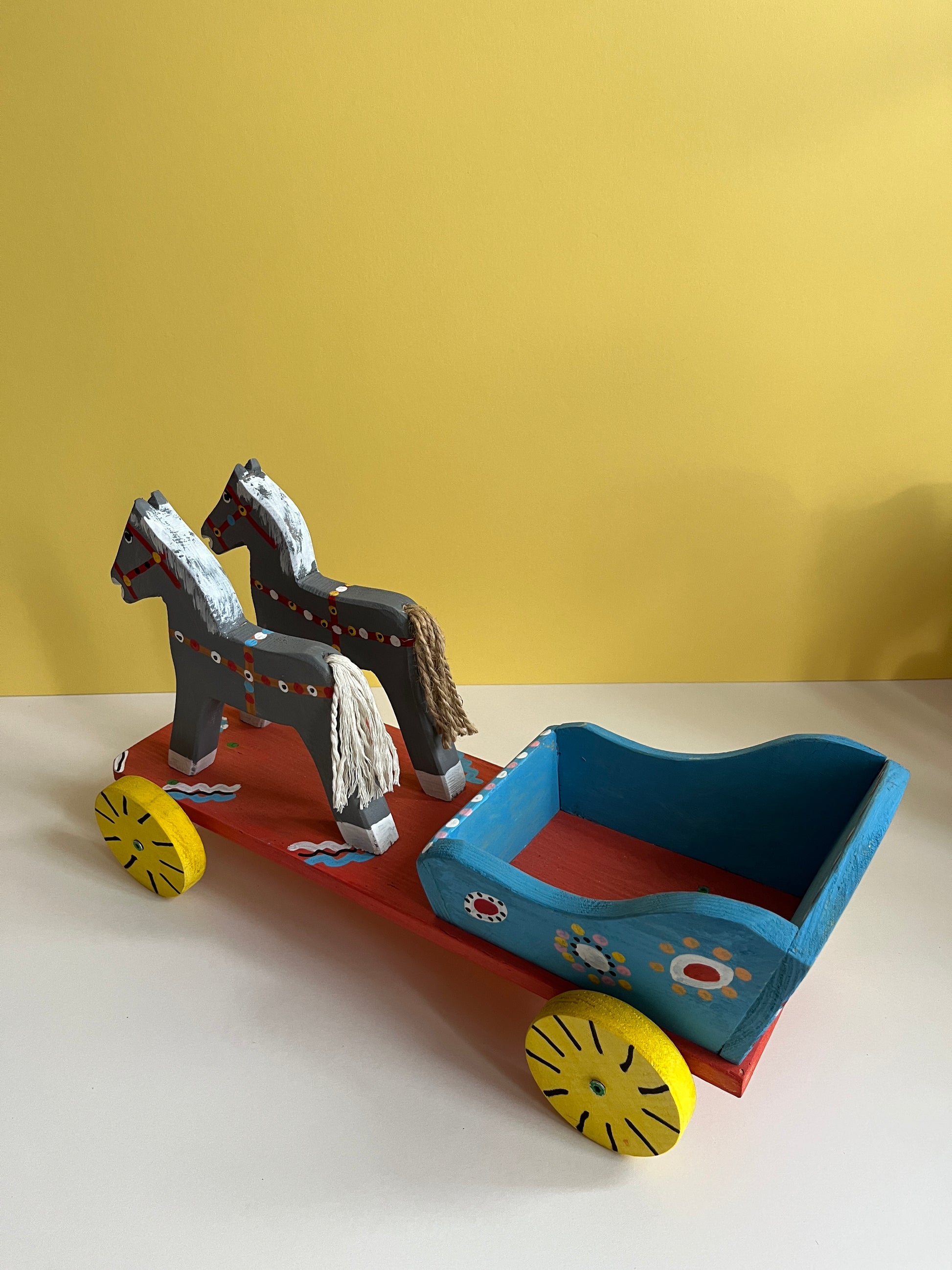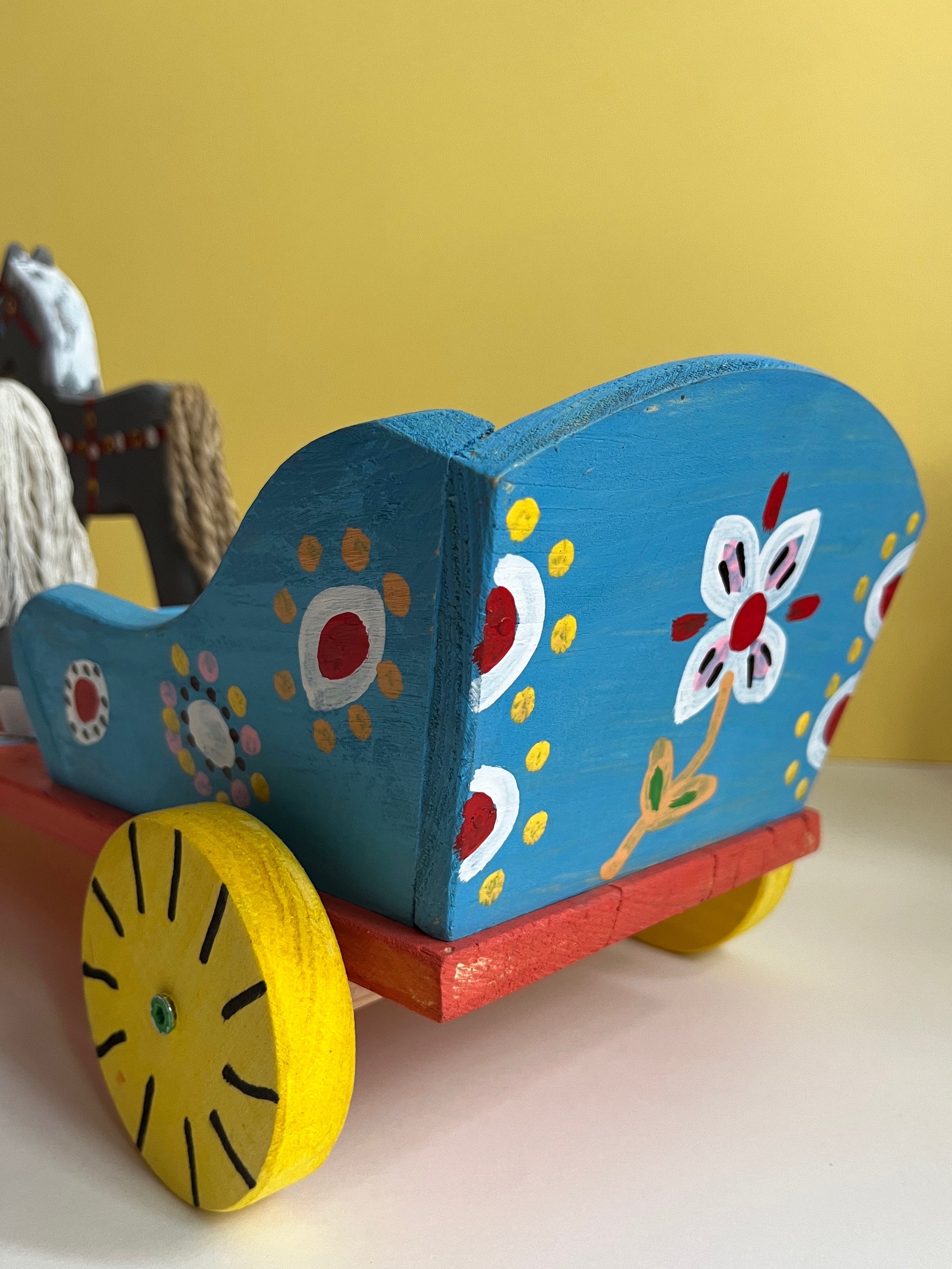 Beautiful pull along wooden horses with a cart. Hand carved in wood, then hand painted by a folk artist Wlodzimierz.