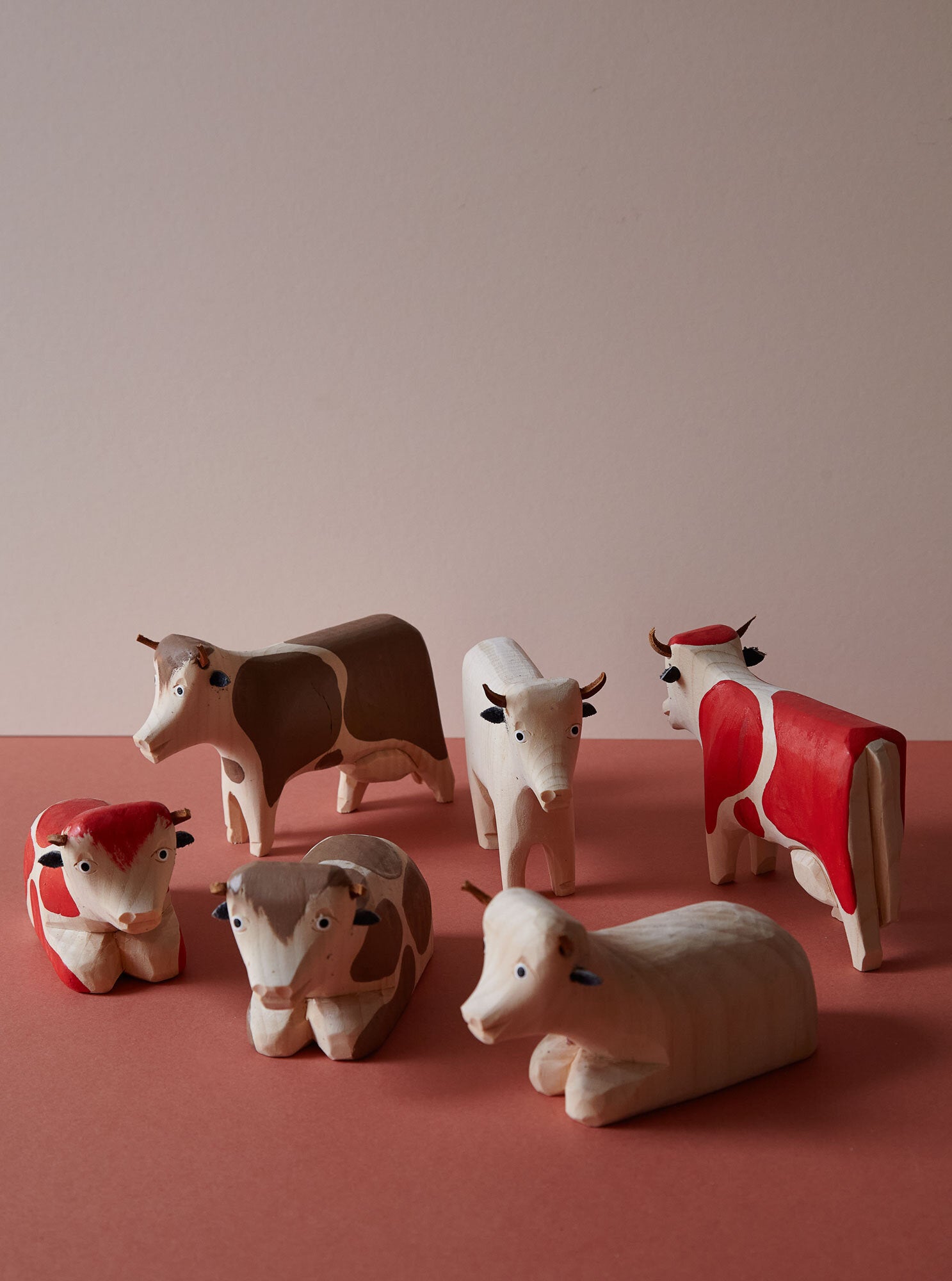 Support the tradition of hand carving wooden toys with this beautiful hand carved and painted cow.
