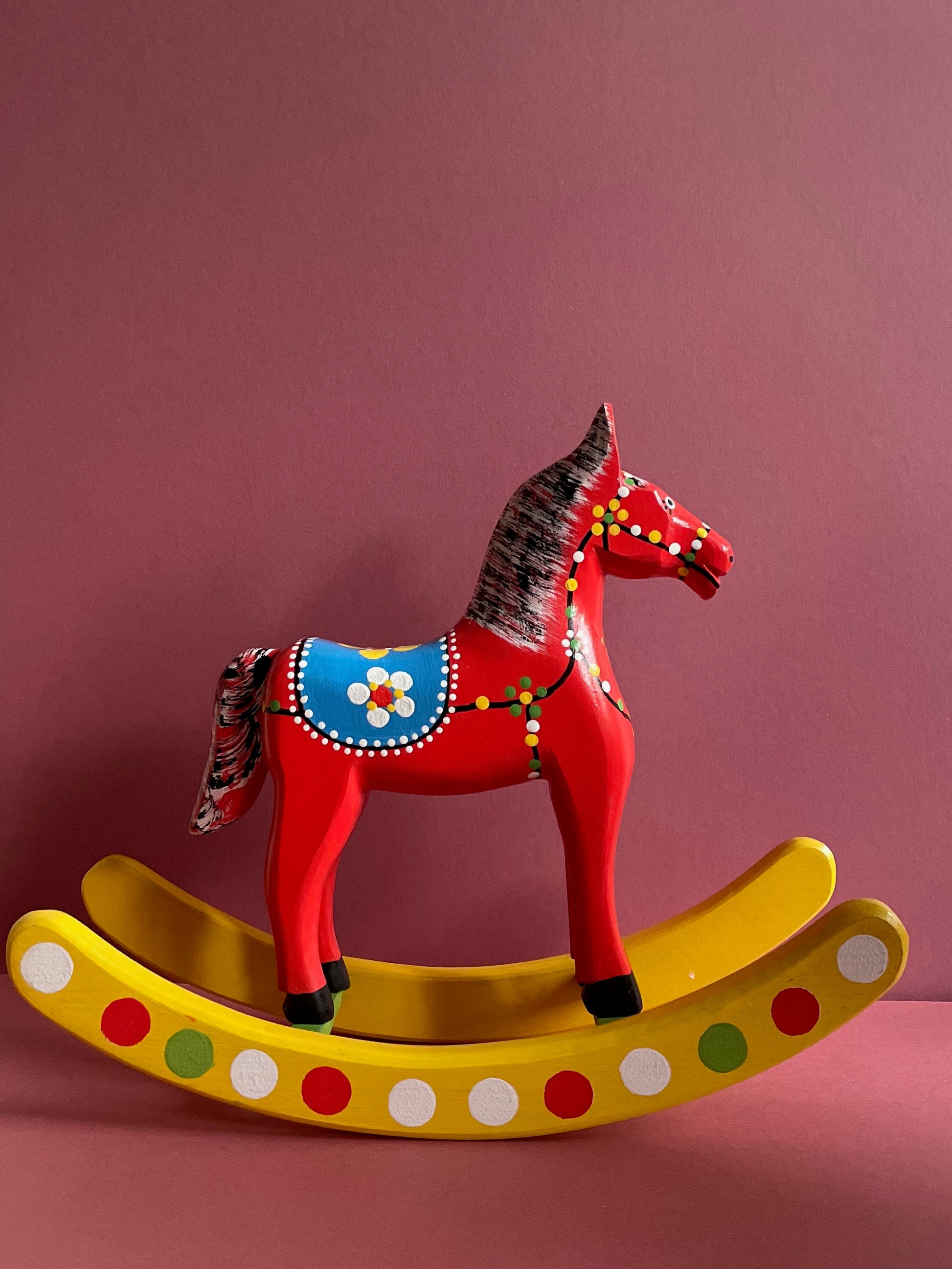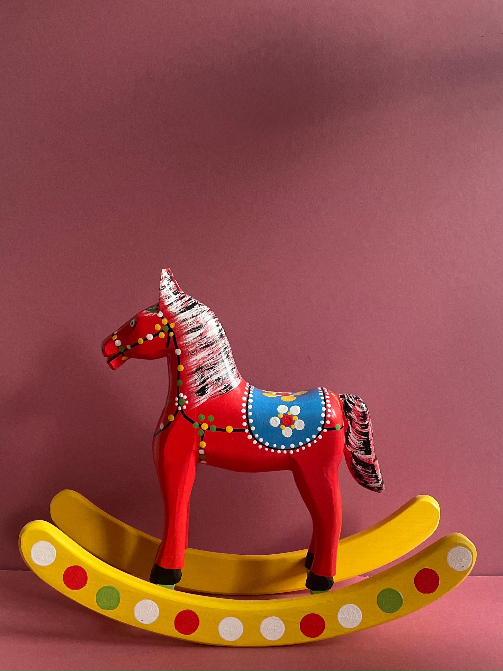Beautiful riding horse hand carved in wood and then hand painted by a folk artist Wiesia. We adore her style - visible brush strokes and colourful dots.