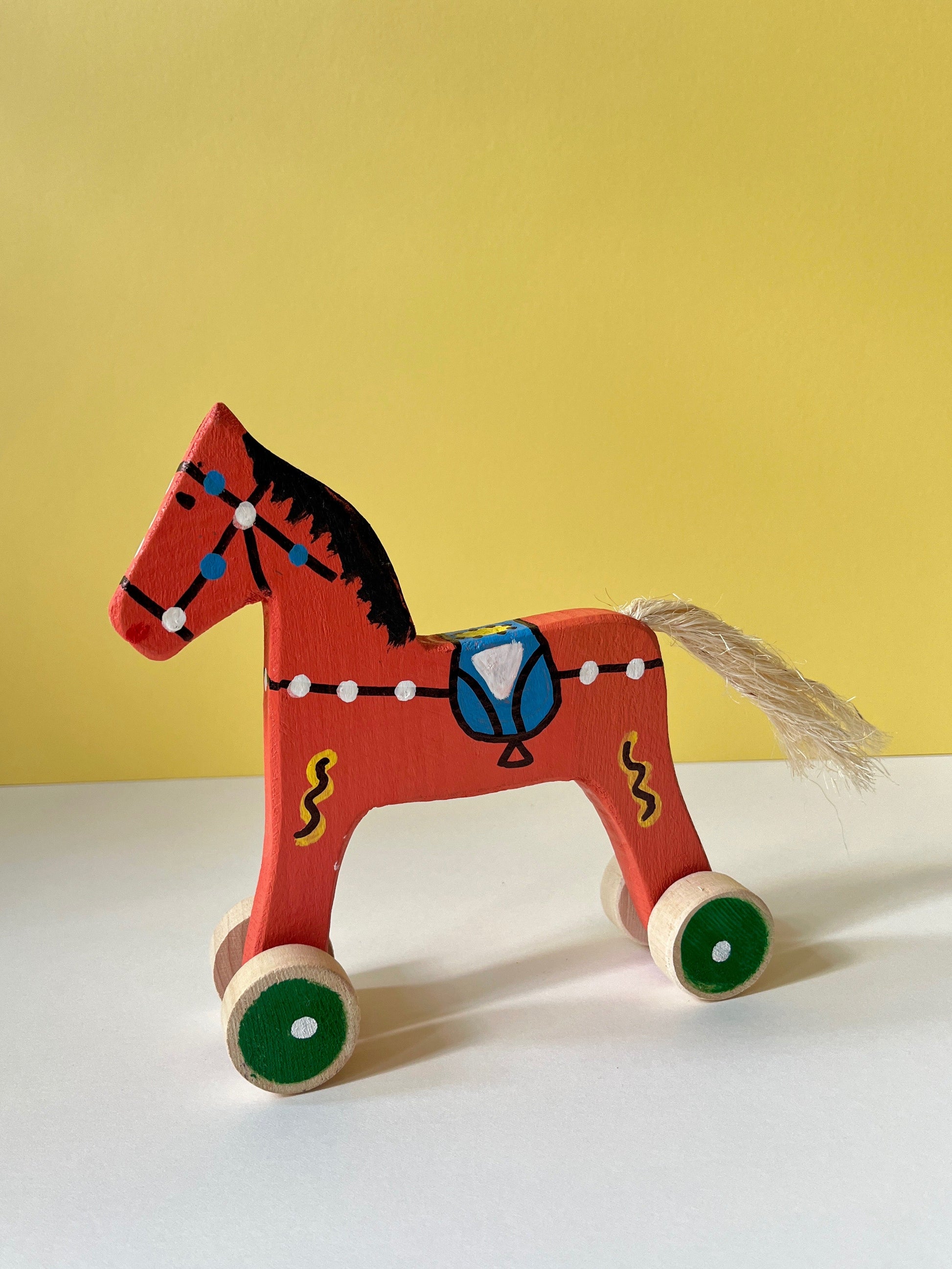 Lovely hand painted wooden horse, it moves when you push it. Hand carved in wood, then hand painted by a folk artist Wlodzimierz.