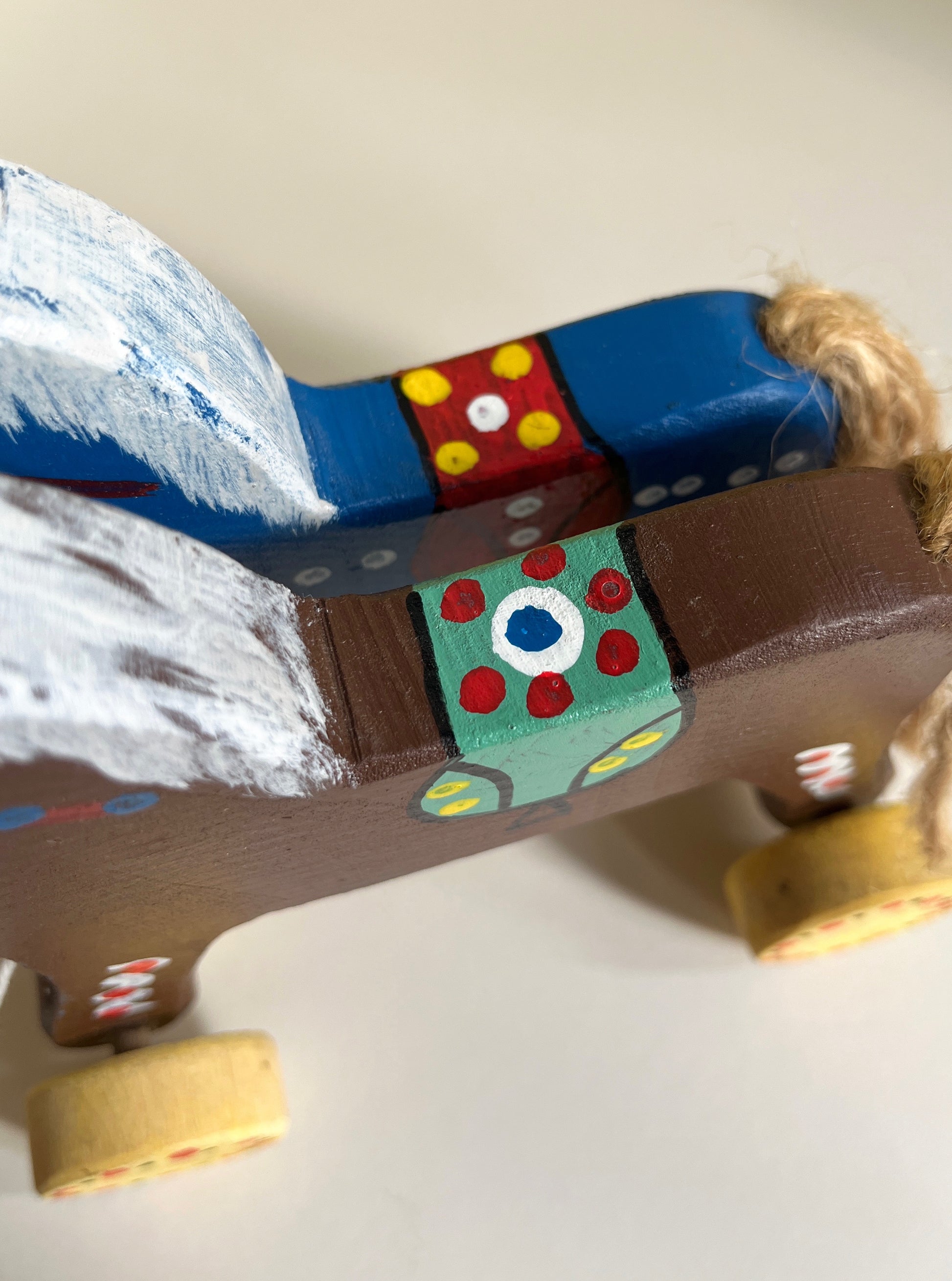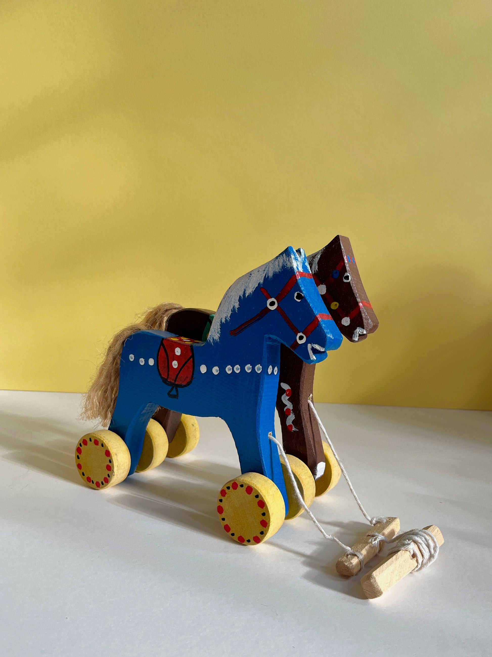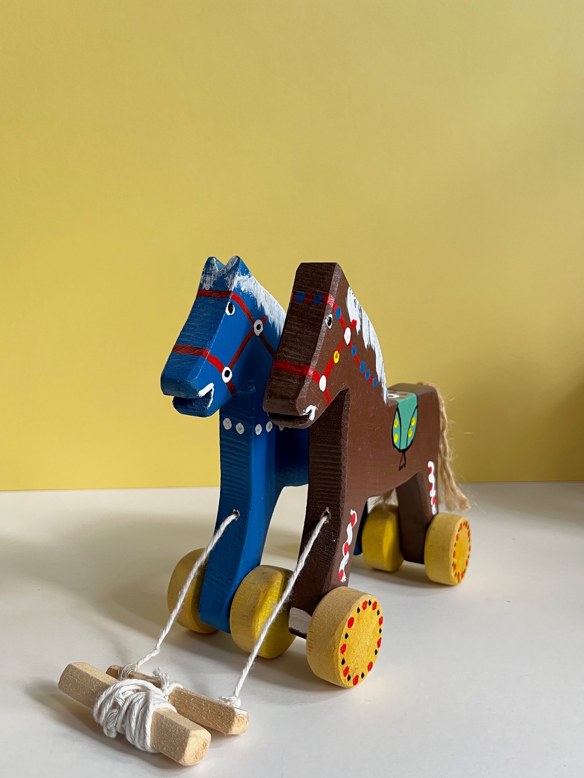Unique pull along wooden horses. Hand carved in wood, then hand painted by a folk artist Wlodzimierz.