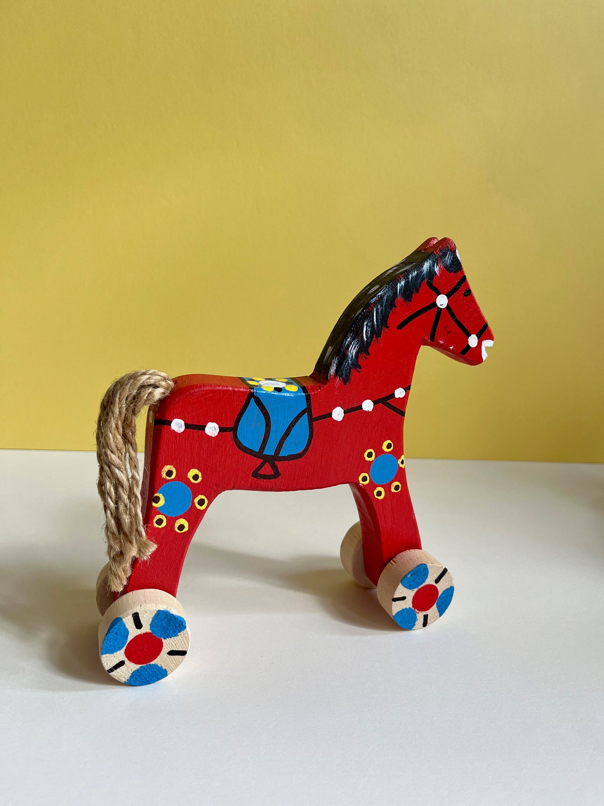 Lovely hand painted wooden horse, it moves when you push it. Hand carved in wood, then hand painted by a folk artist Wlodzimierz.