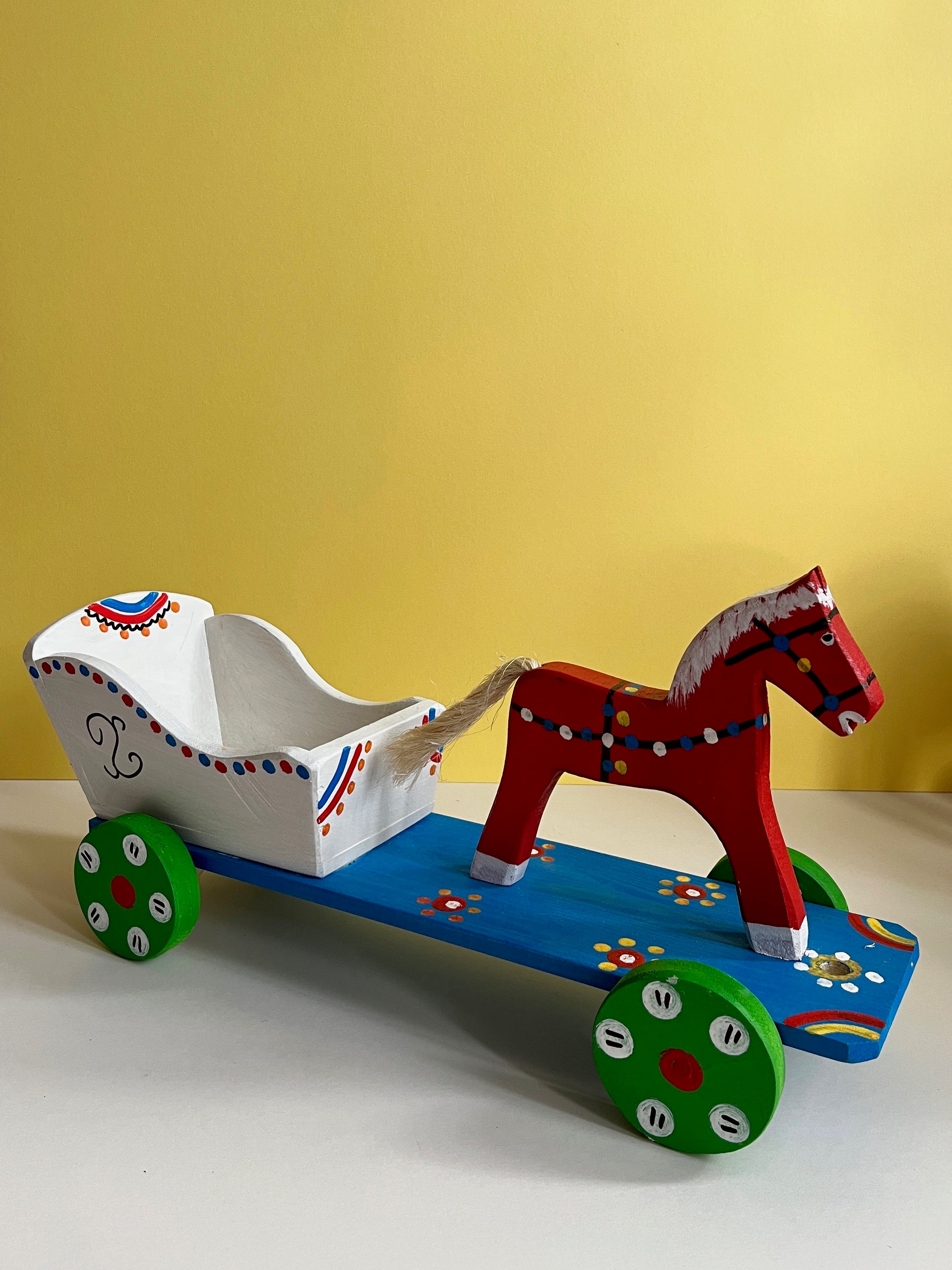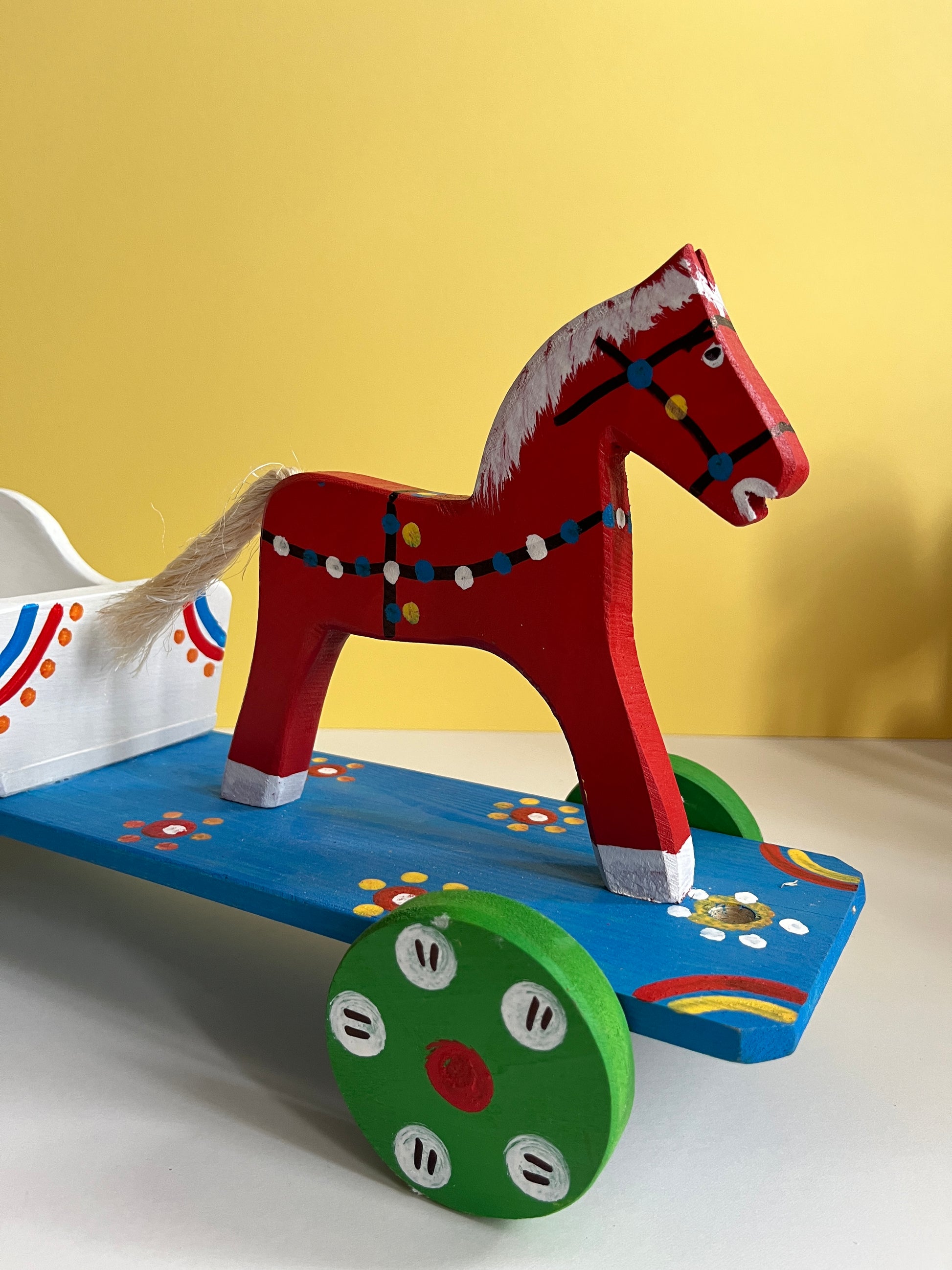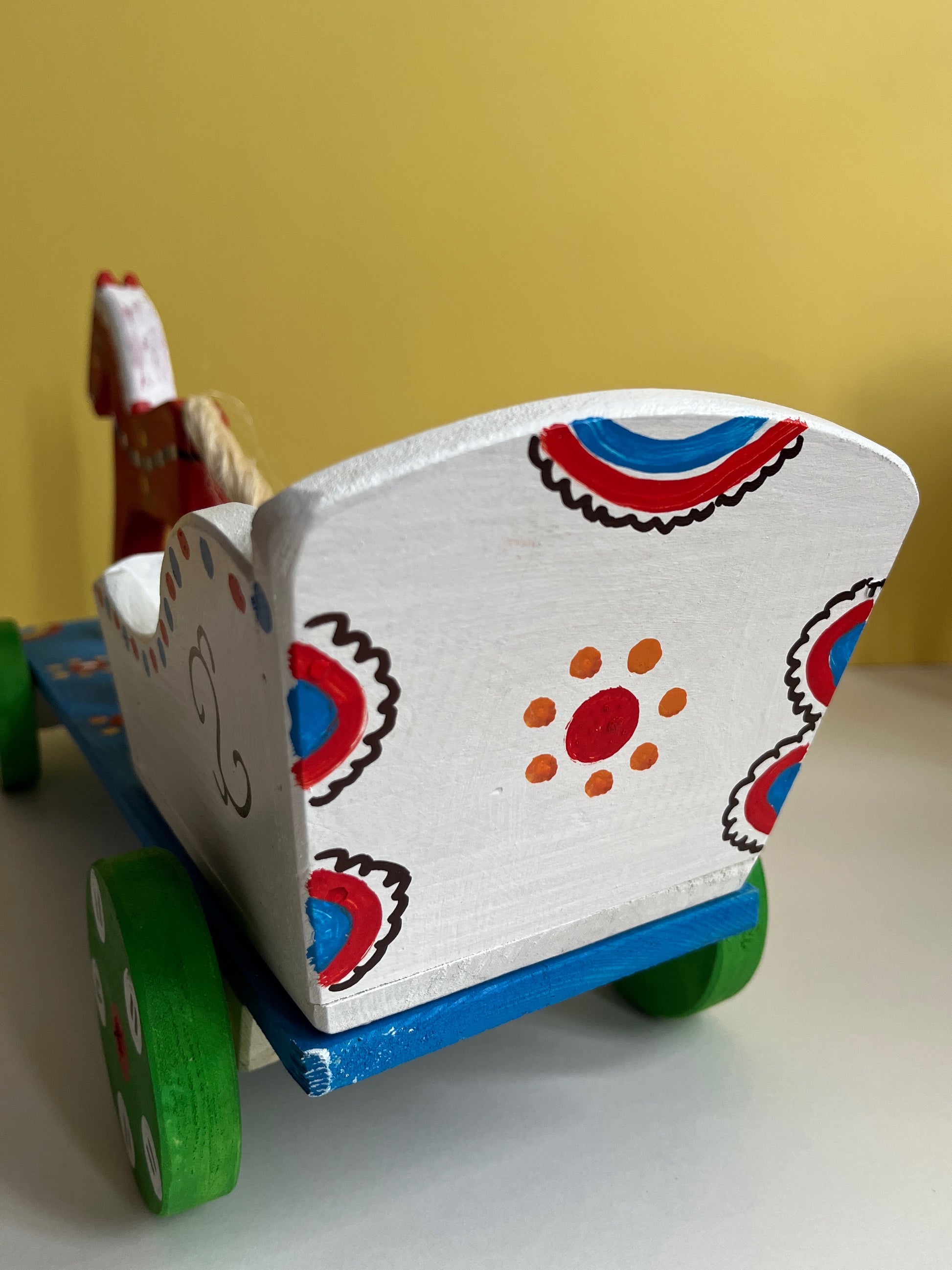 Beautiful pull along wooden horse with a cart. Hand carved in wood, then hand painted by a folk artist Wlodzimierz.