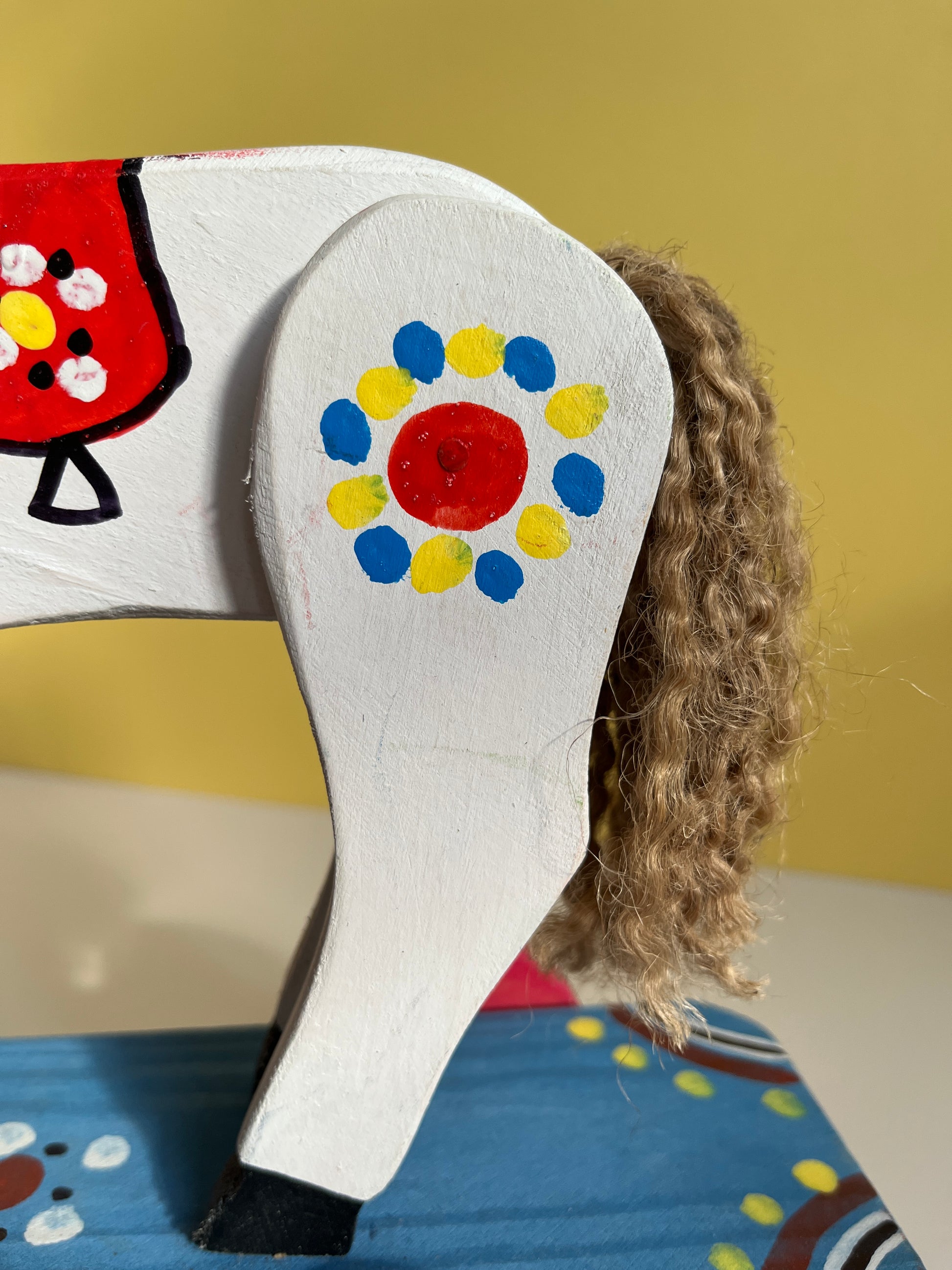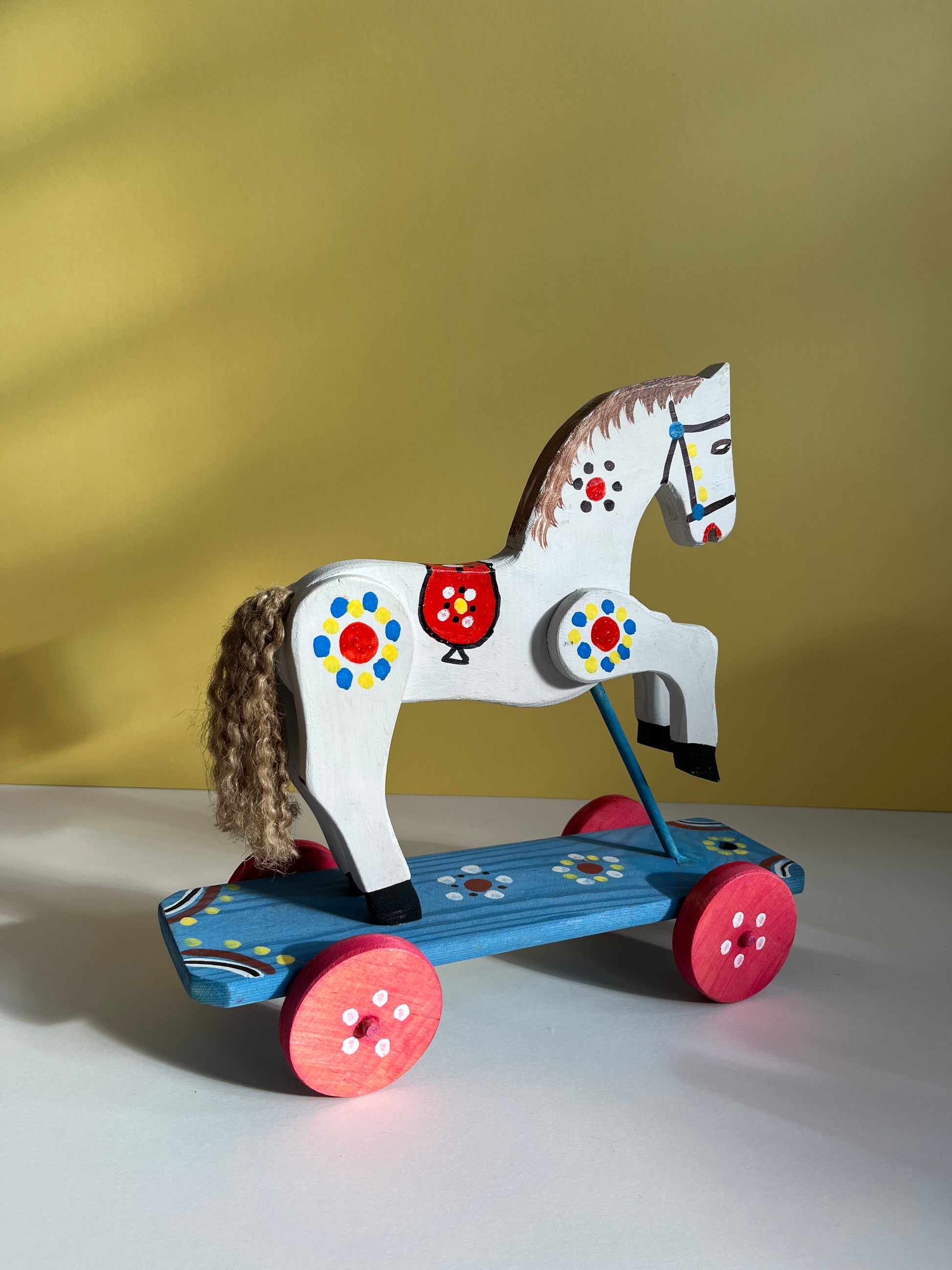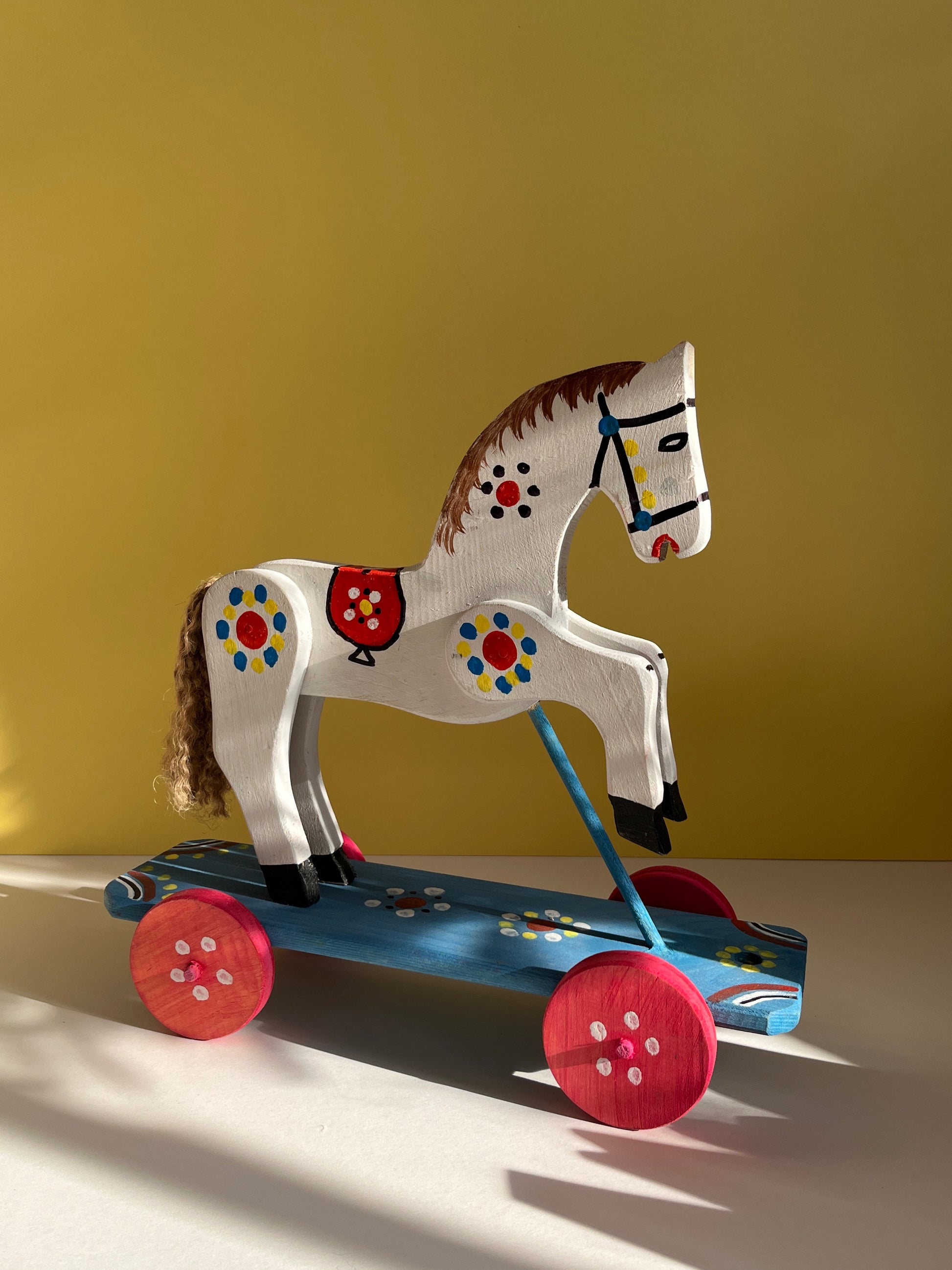Beautiful pull along wooden horse. Hand carved in wood, then hand painted by a folk artist Wlodzimierz.