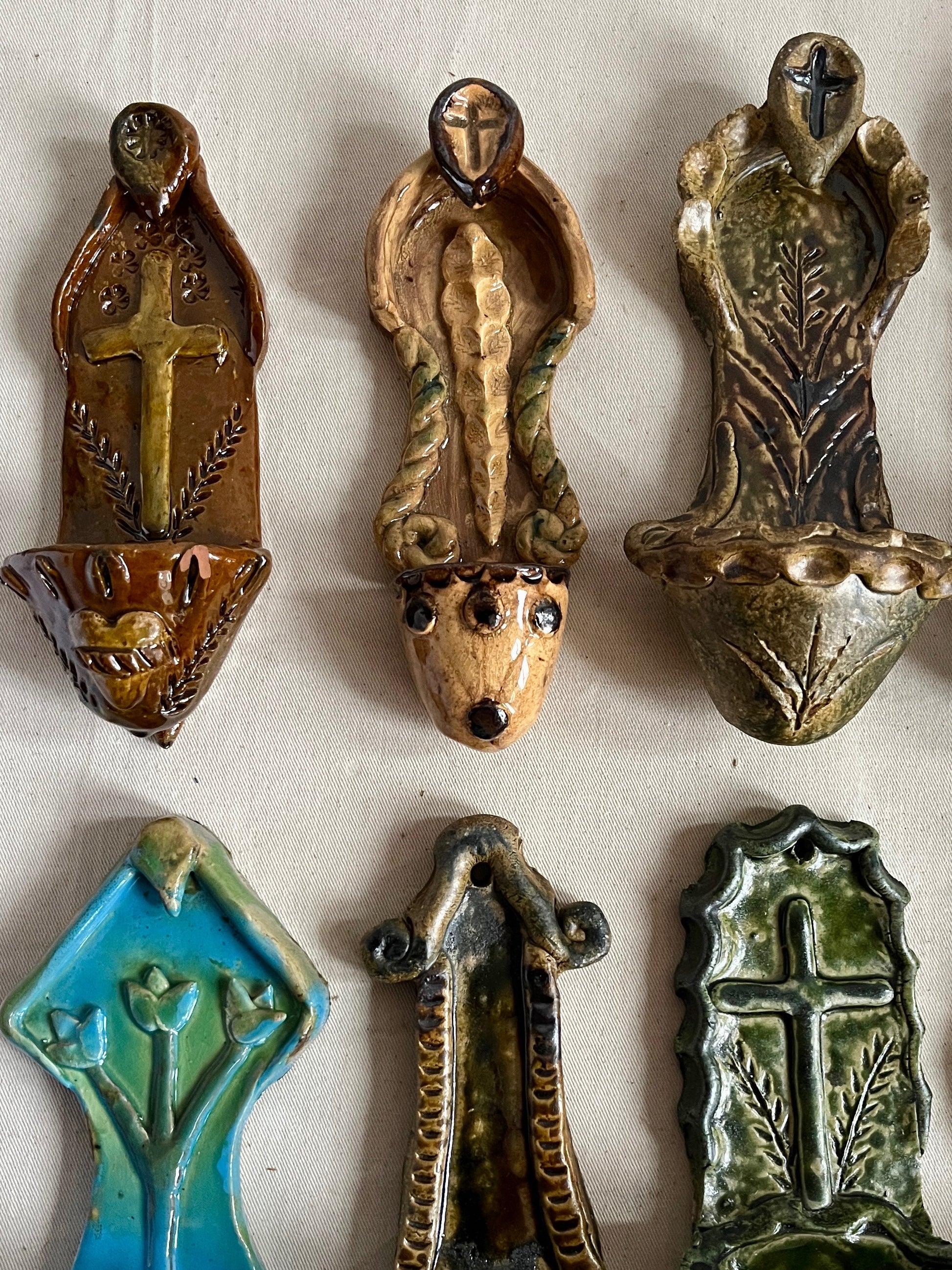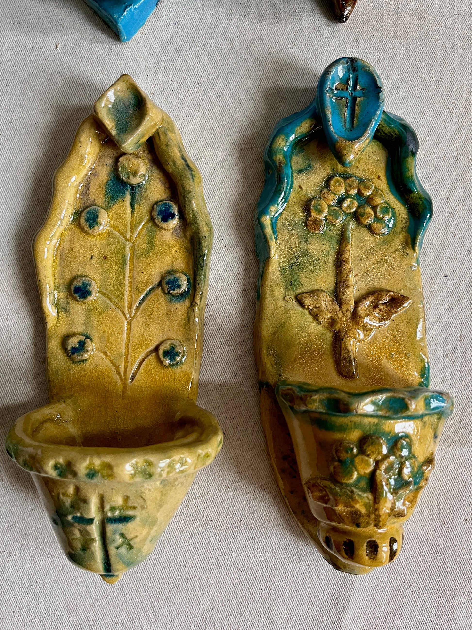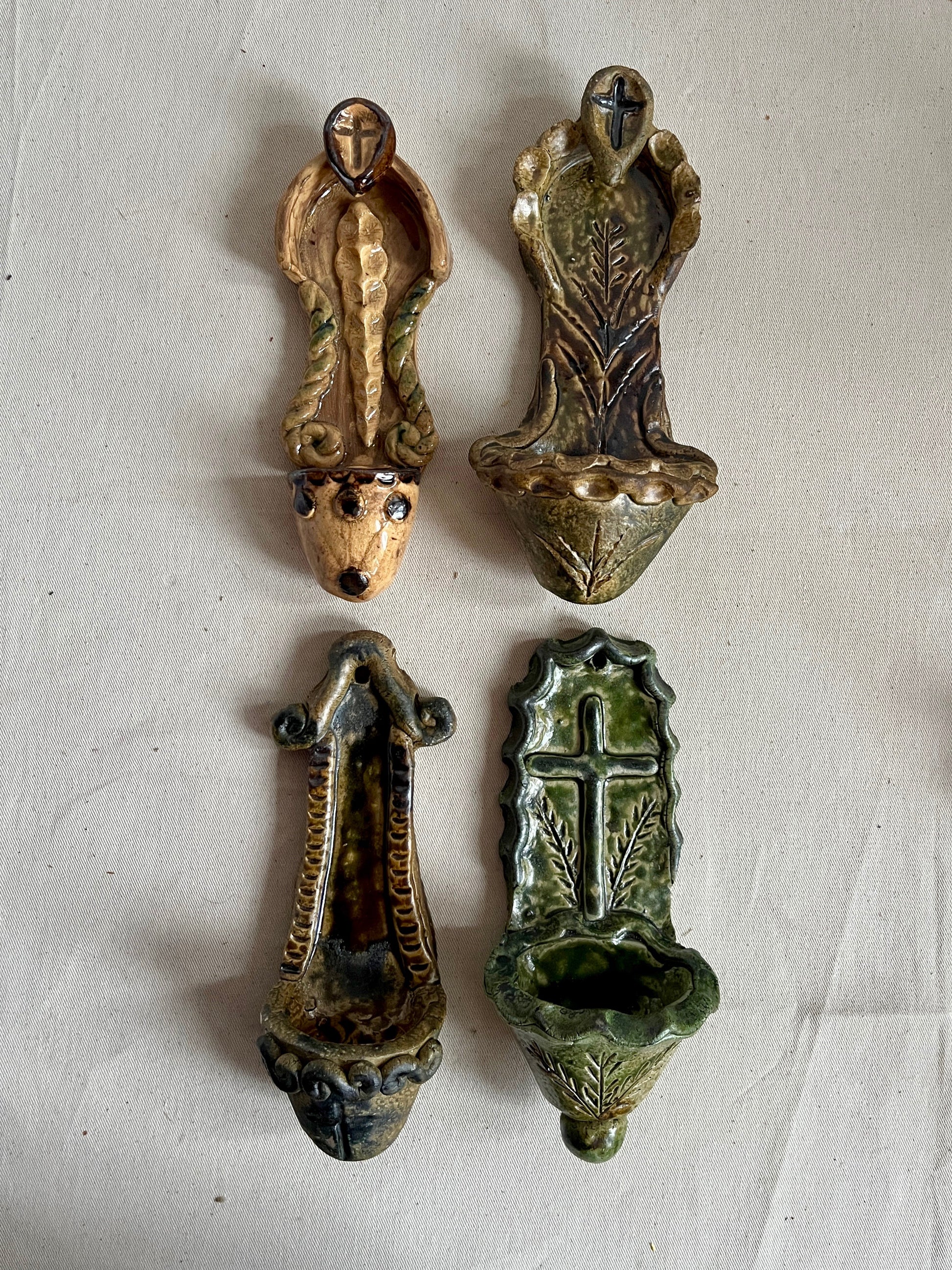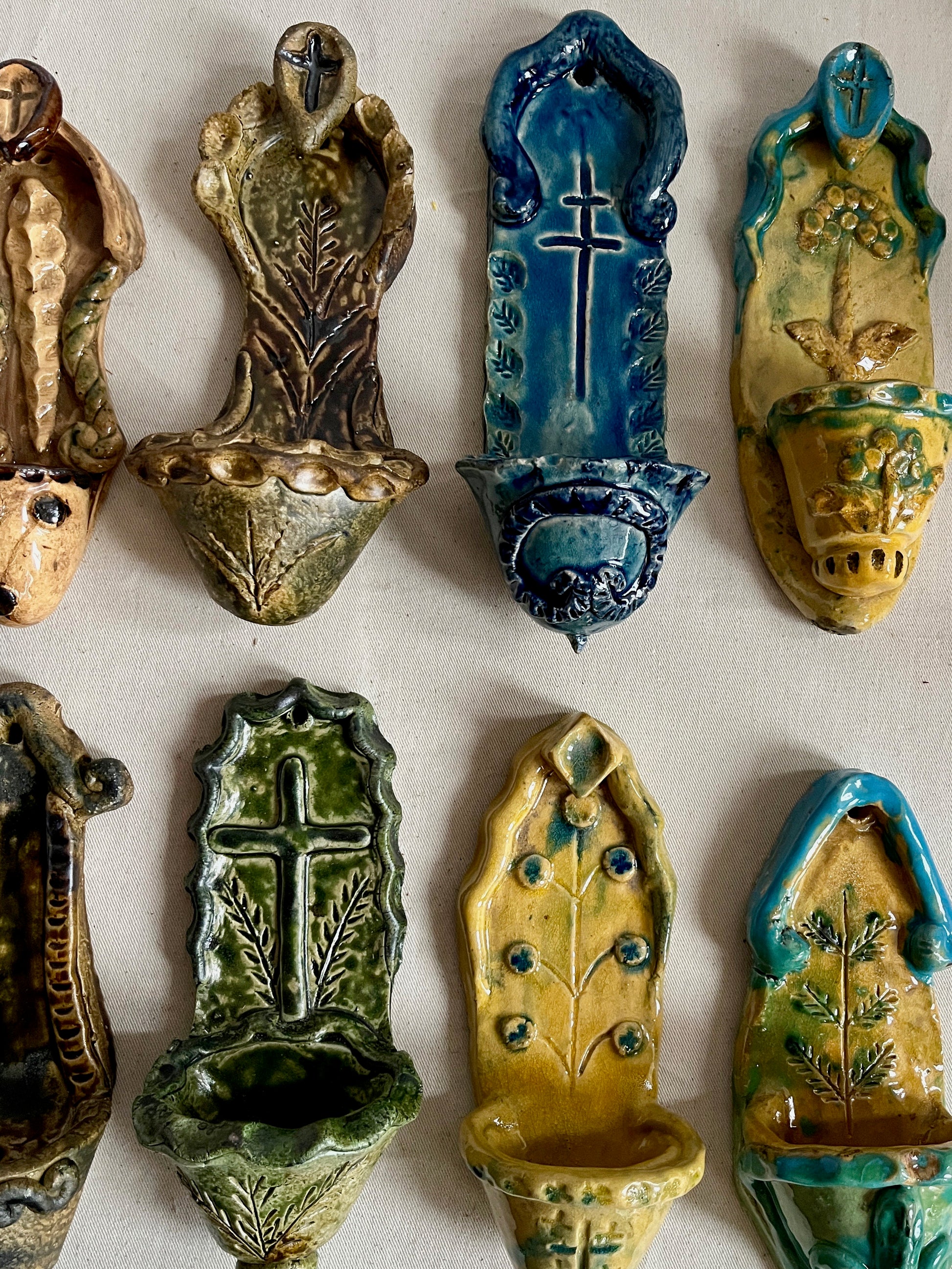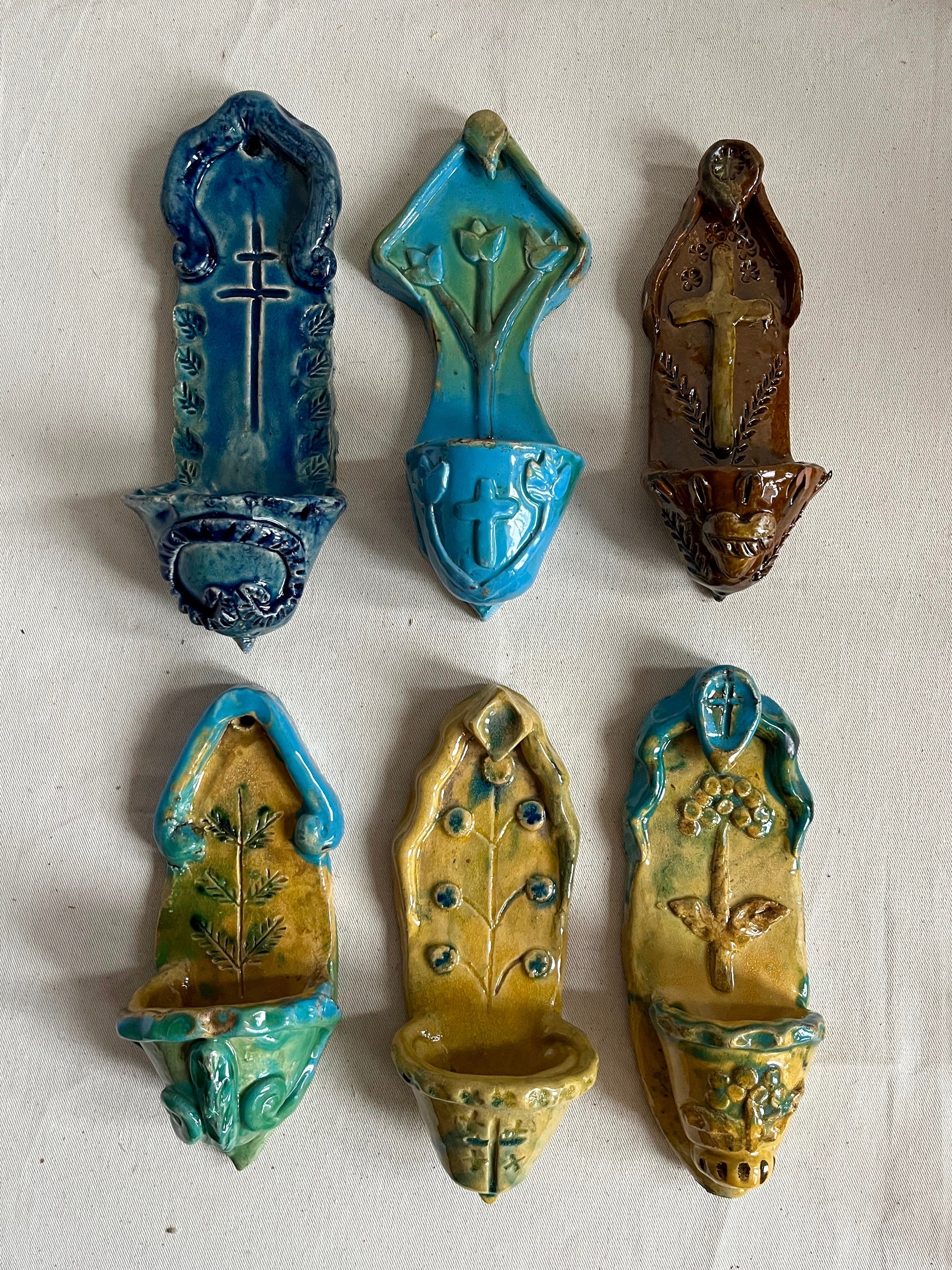 Each stoup is hand built, fired and glazed by artist Radosław. His details, colours, and variety of ornaments is incredible. Each piece is unique. It's a real piece of art.