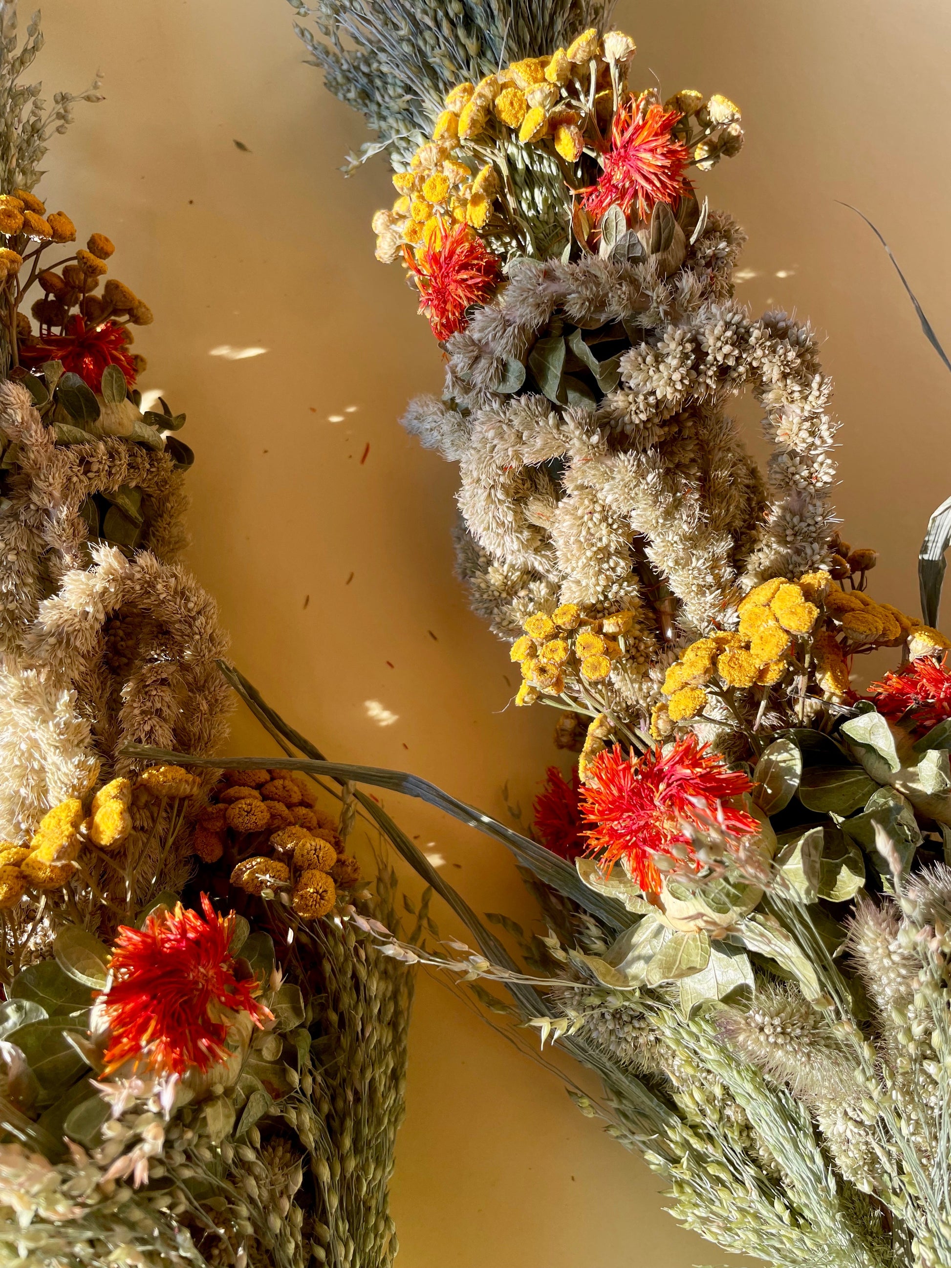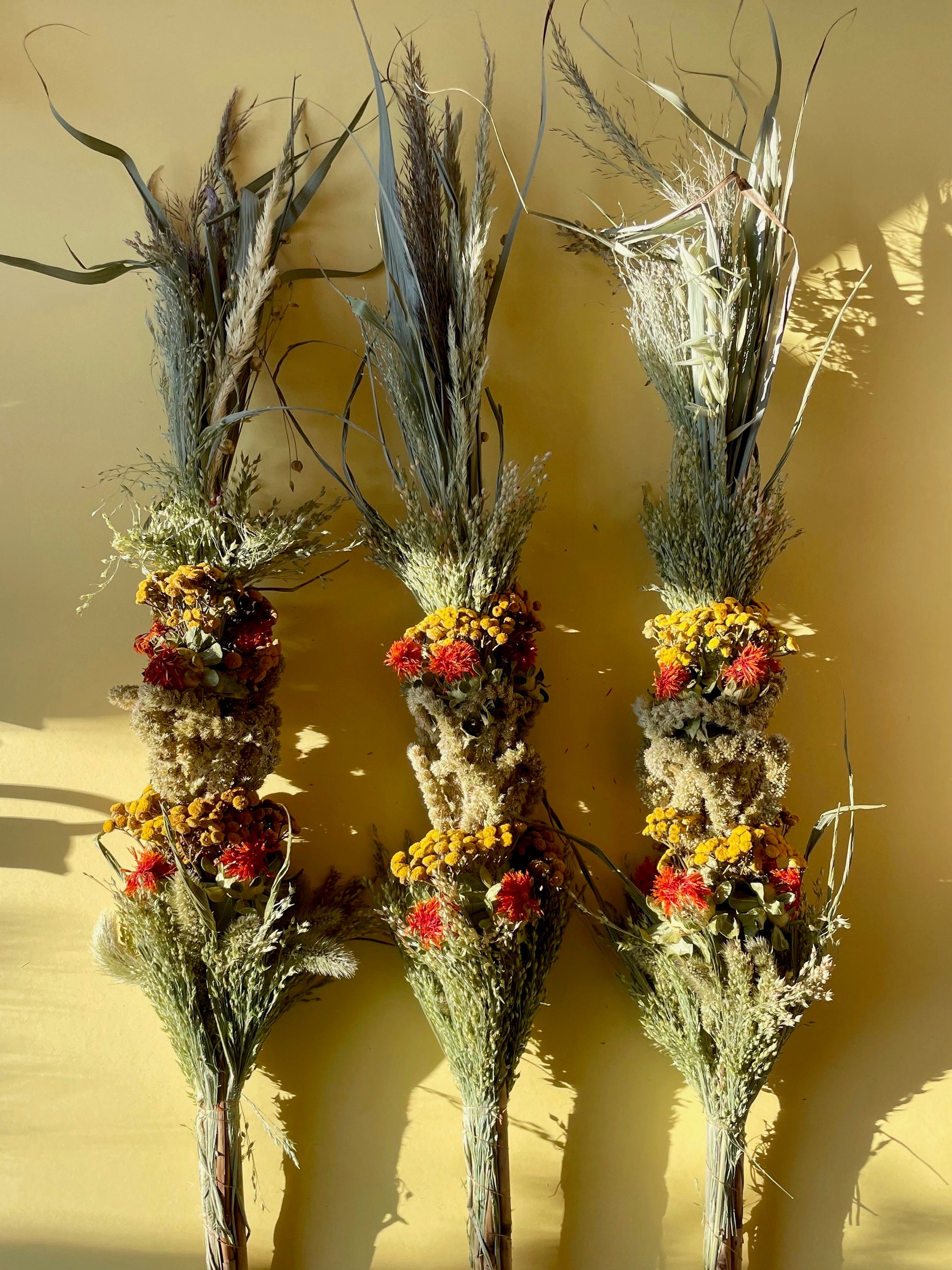Beautiful Easter Palm made with dried flowers - yellow achillea and orange saflowers, straw and grass.