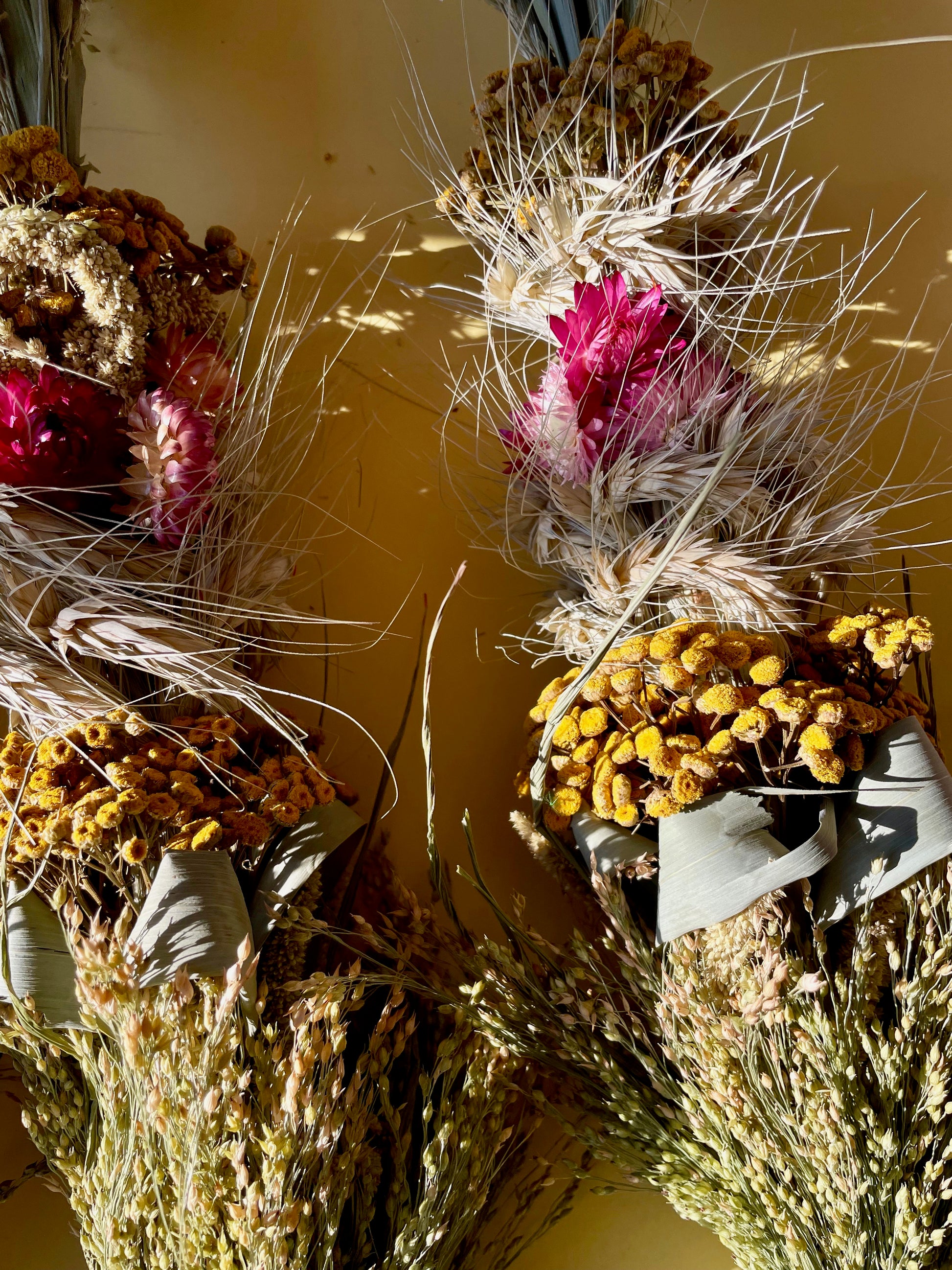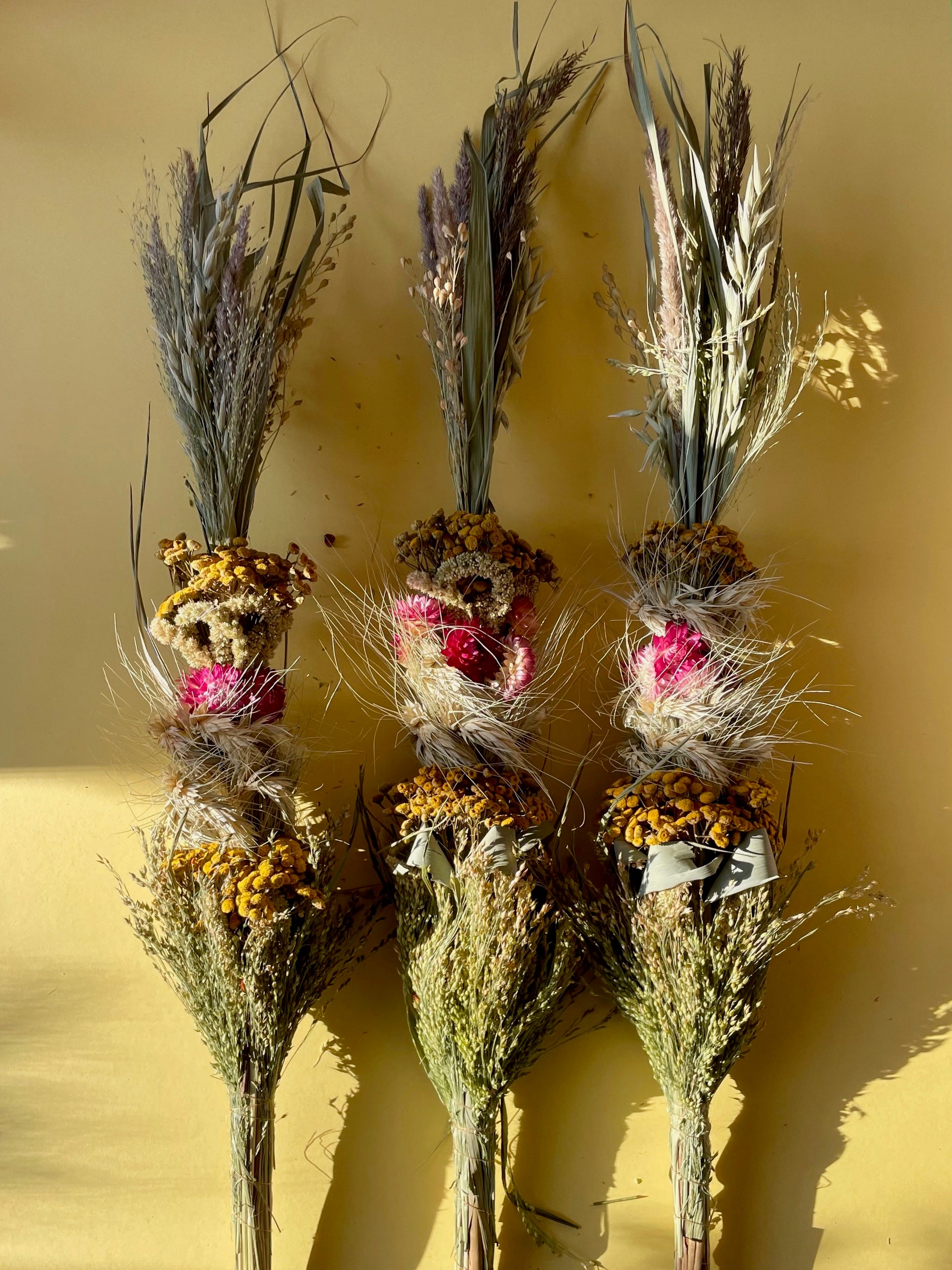 Beautiful Easter Palm made with dried flowers - yellow achillea and pink strawflowers, straw and grass.