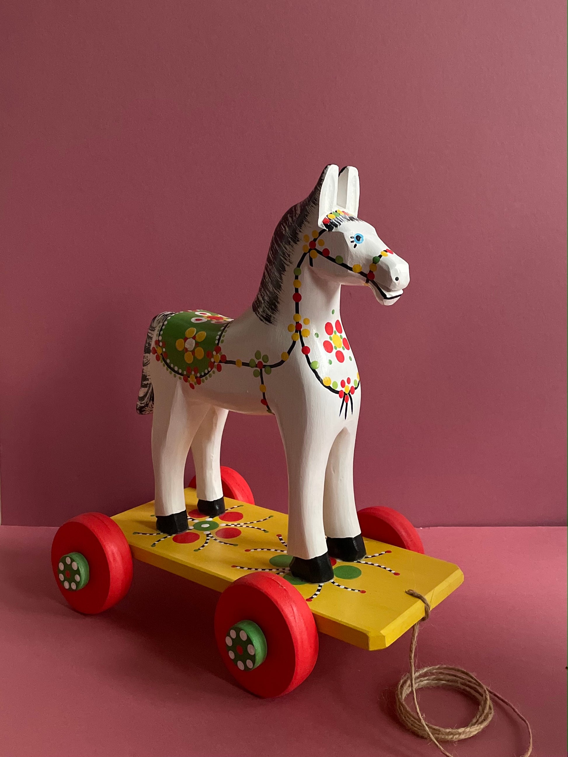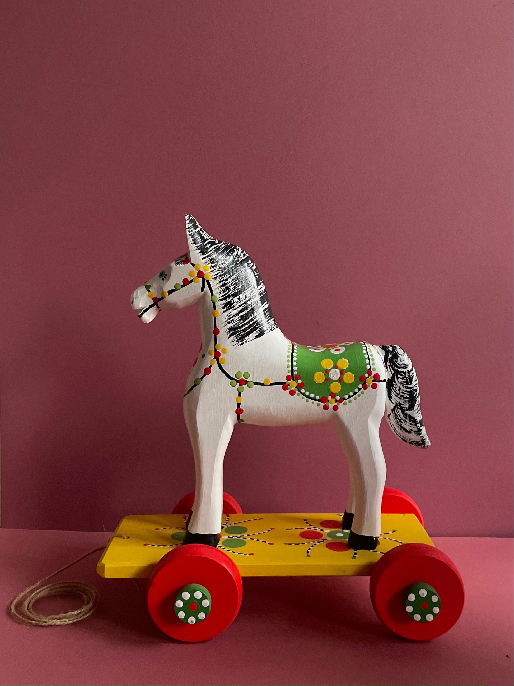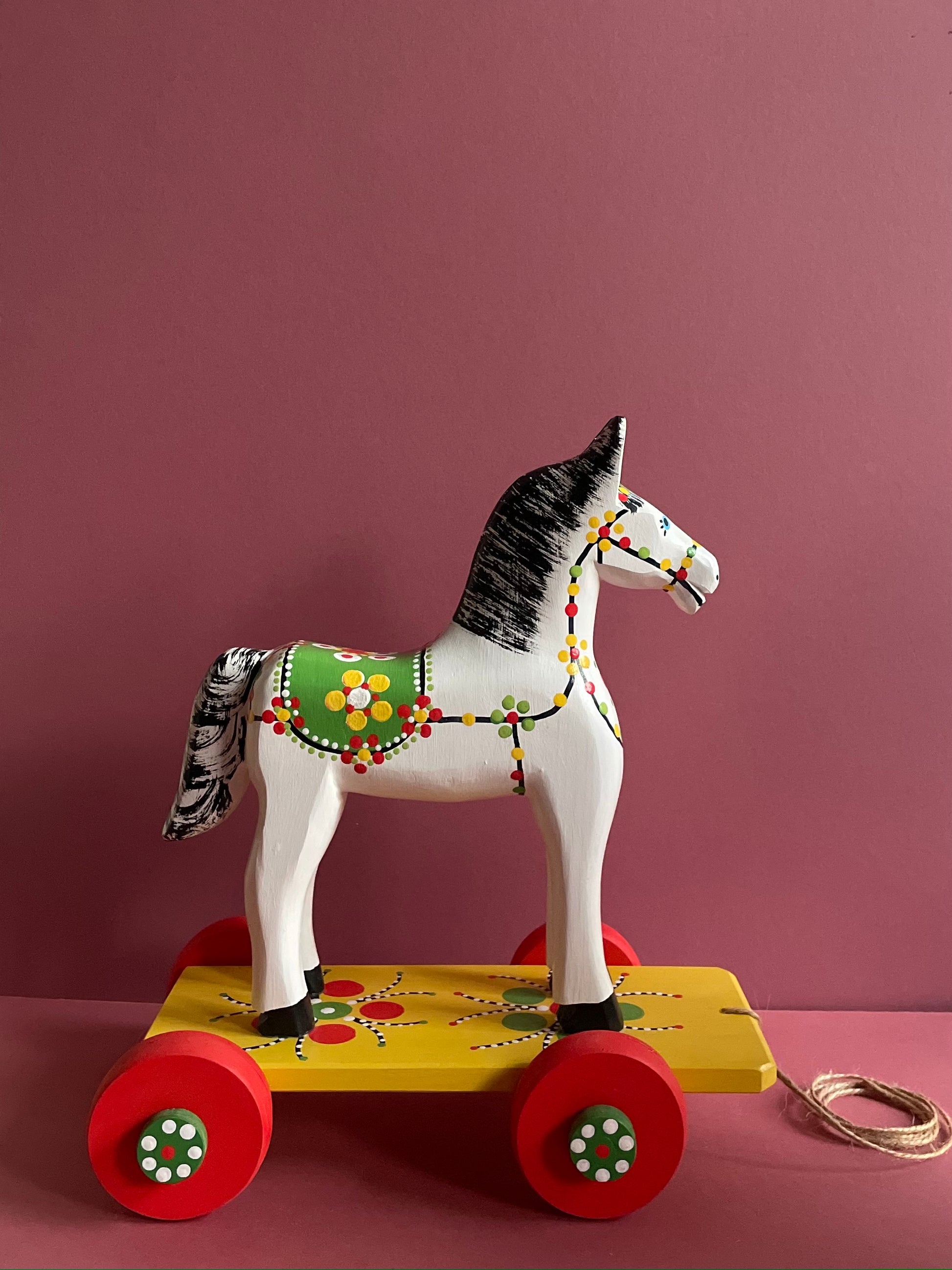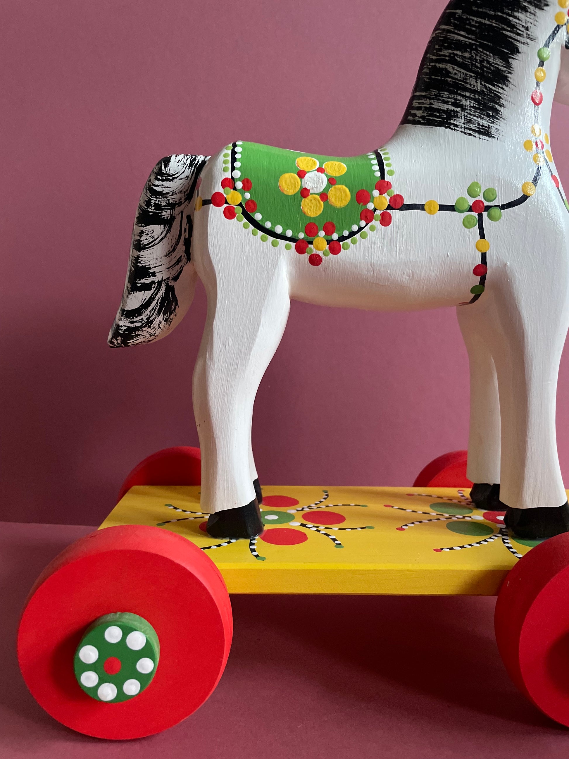 Beautiful pull along horse hand carved in wood and then hand painted by a folk artist Wiesia. We adore her style - visible brush strokes and colourful dots.