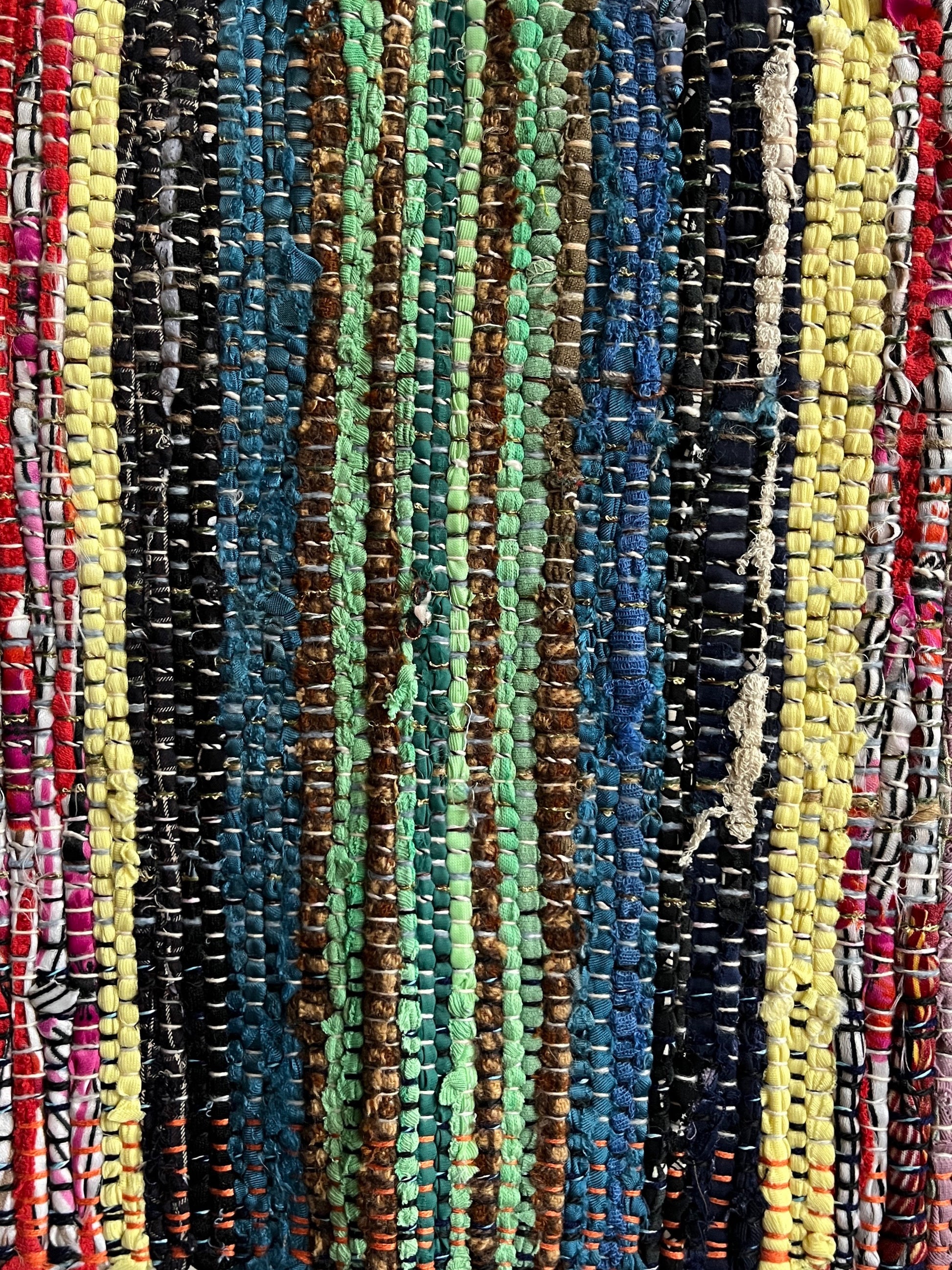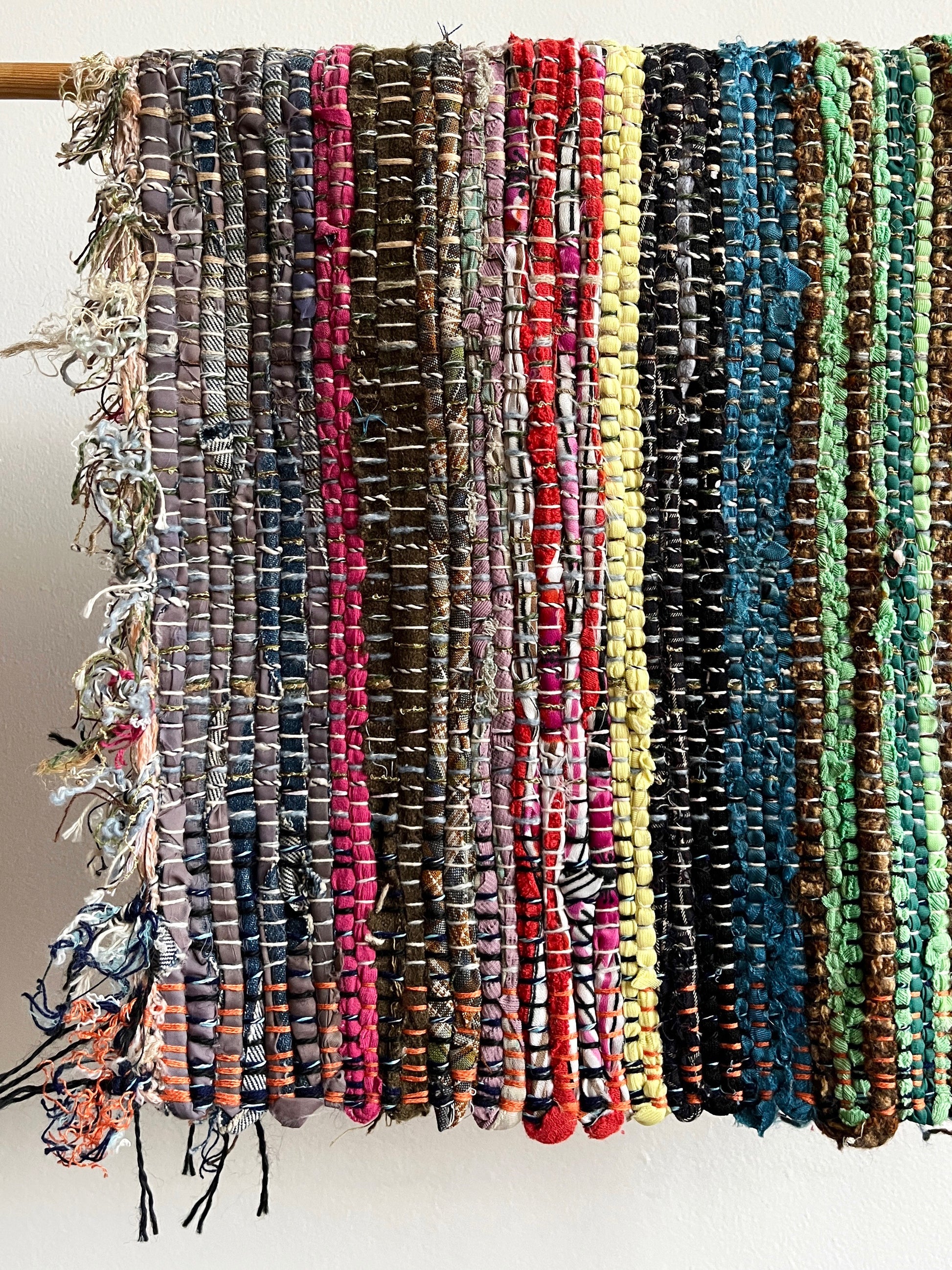 Each rug is unique and hand woven by Anna on a loom using various recycled fabrics, mostly cotton.