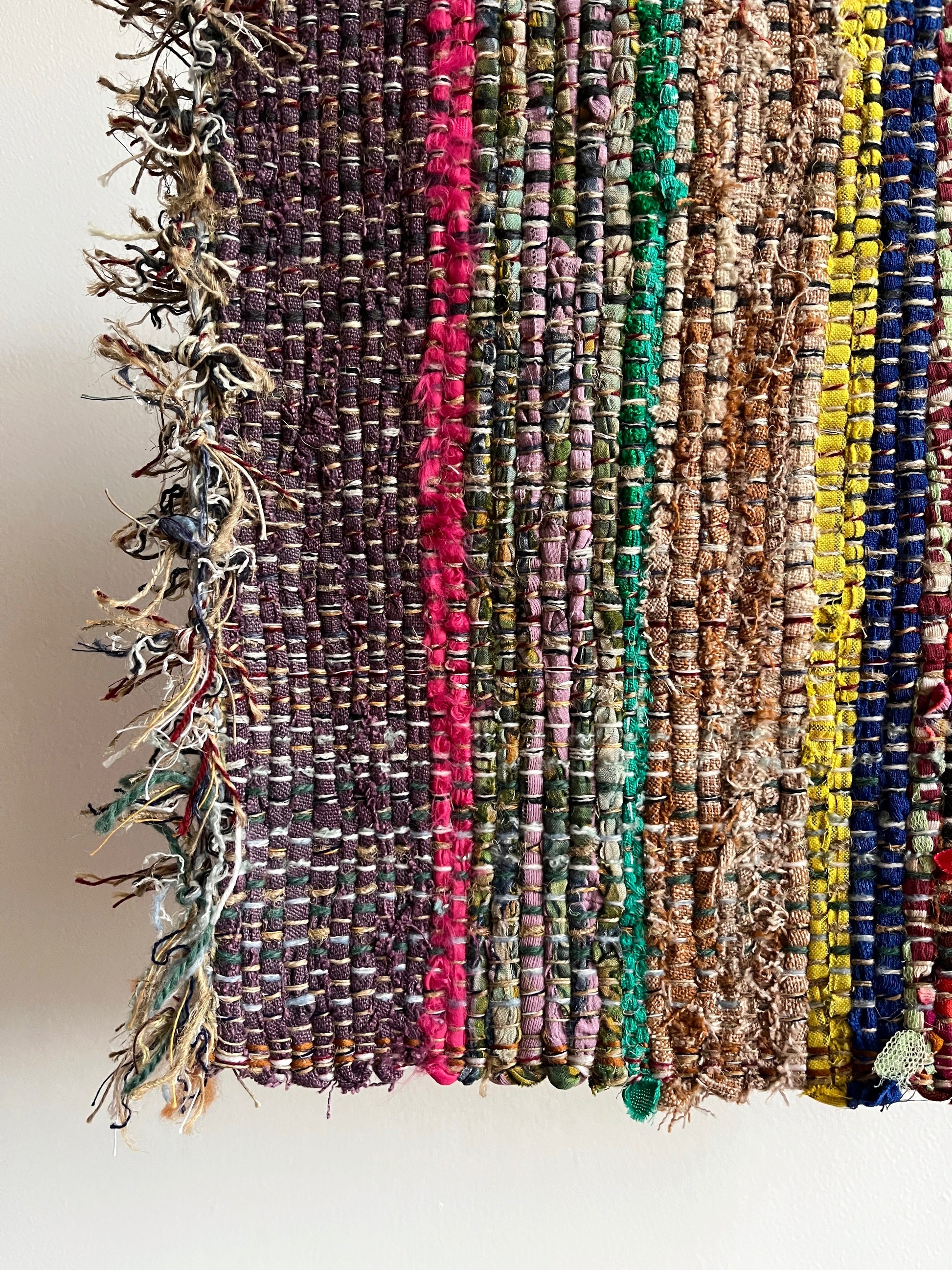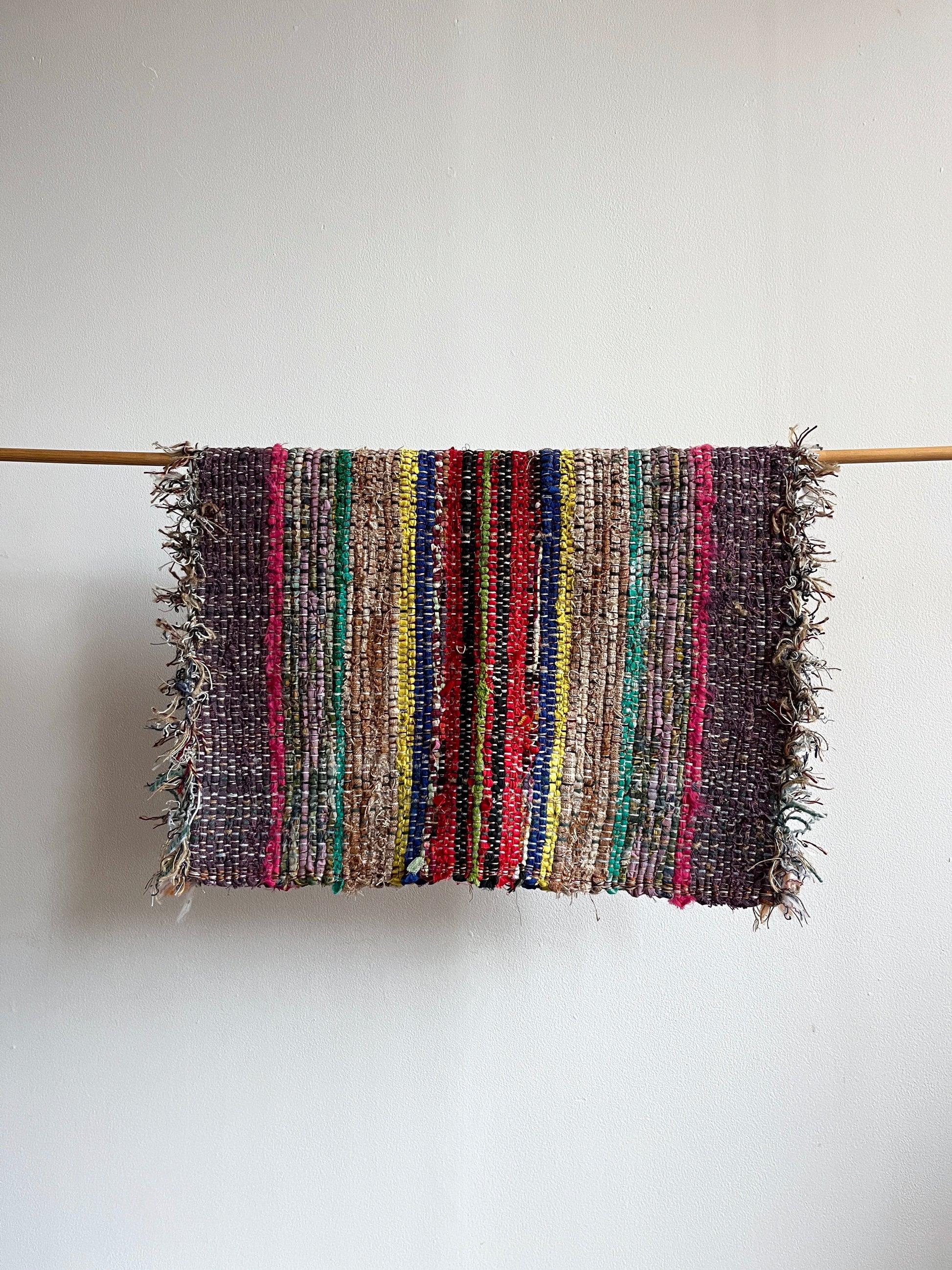 Each rug is unique and hand woven by Anna on a loom using various recycled fabrics, mostly cotton.