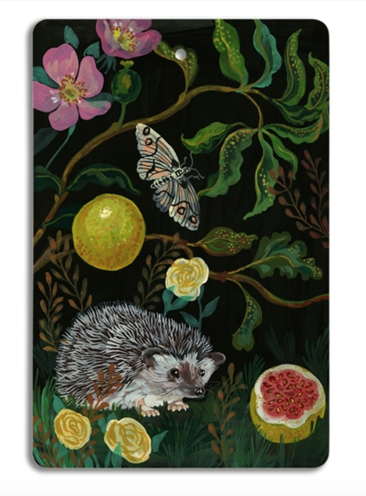 This rectangular serving board features a stunning painting by French artist Nathalie Lété. Beautifully painted hedgehog surrounded by vibrant flowers and a butterfly in a nighttime garden. Originally made as a chopping board it can be used as a cheese board or as a hanging decoration anywhere in your home!