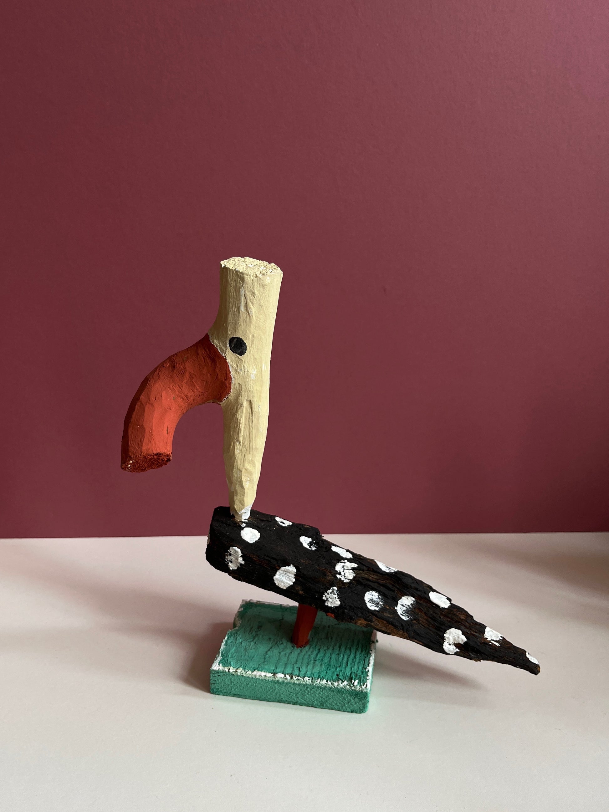 Using various tree branches and pieces of old wood, Dionizy creates unique, whimsical sculptures. His favourites are birds, angels and saints. We love his bold colours and characteristic dots!