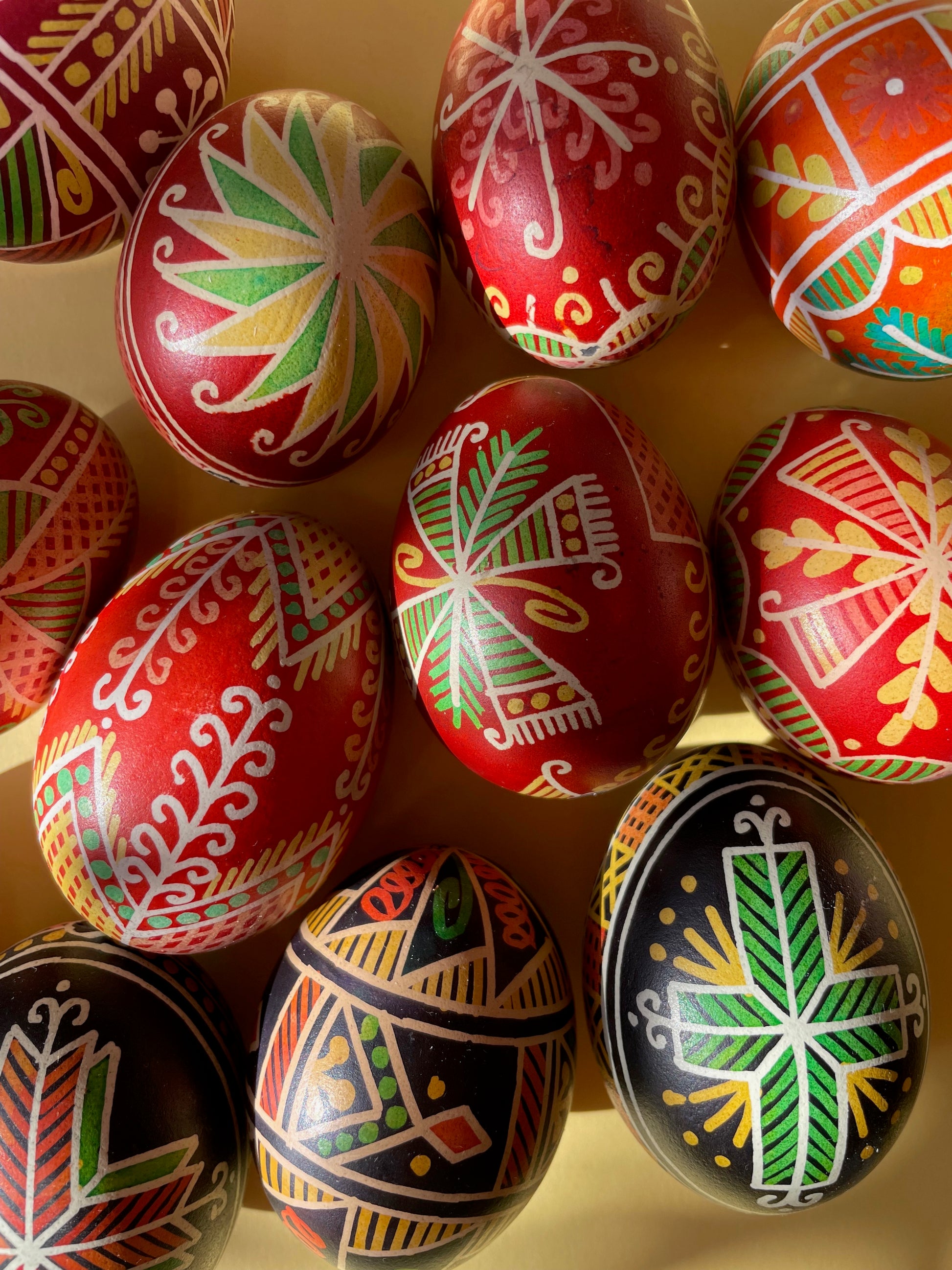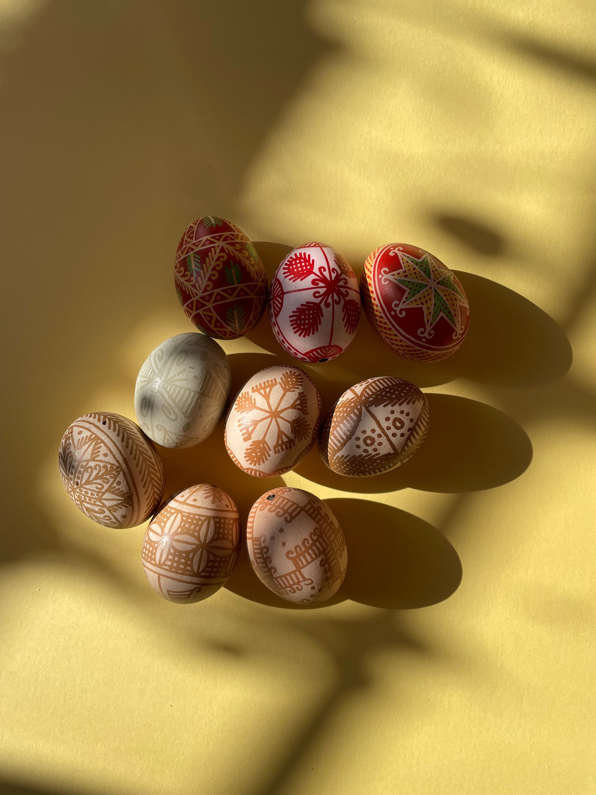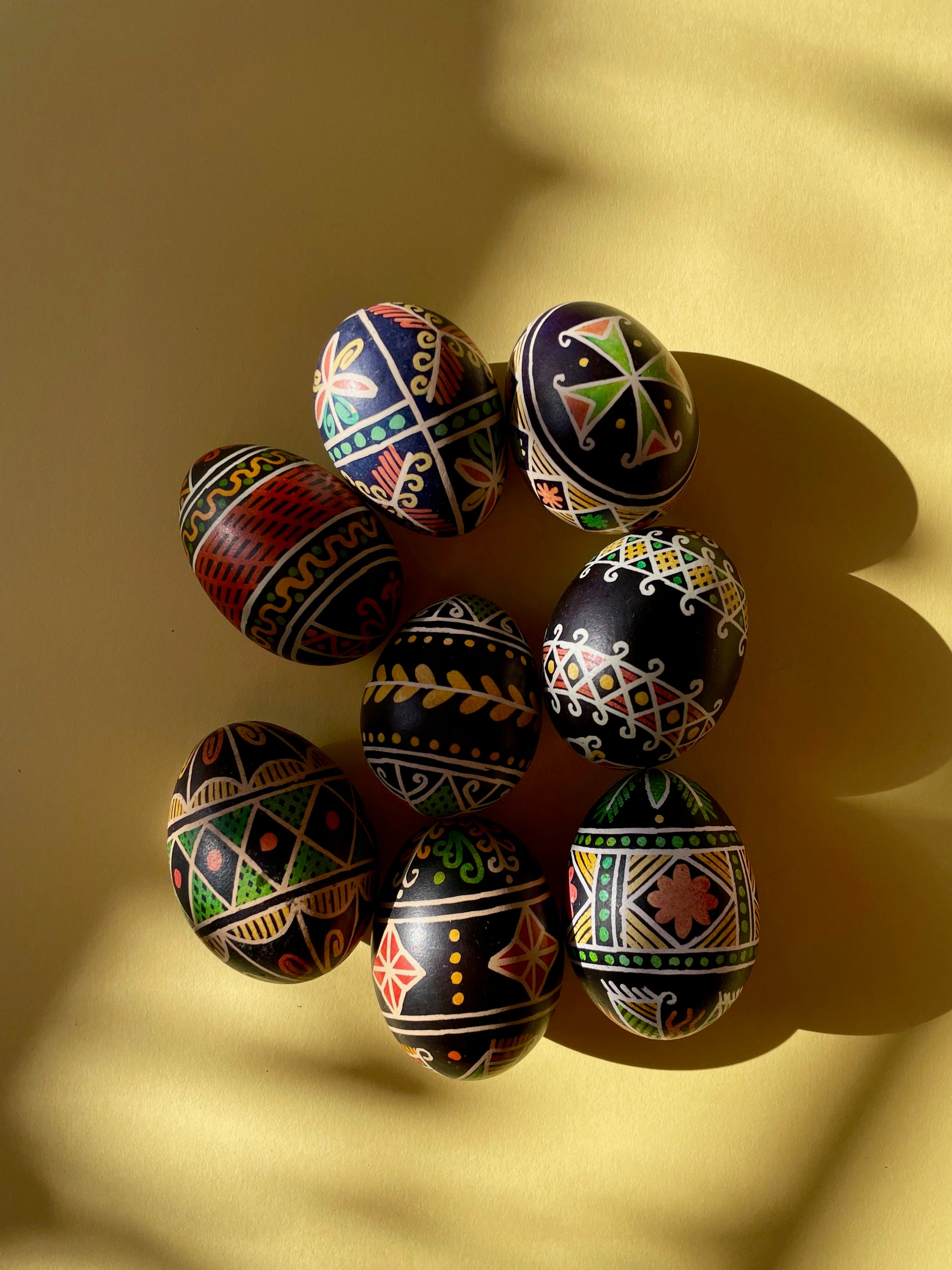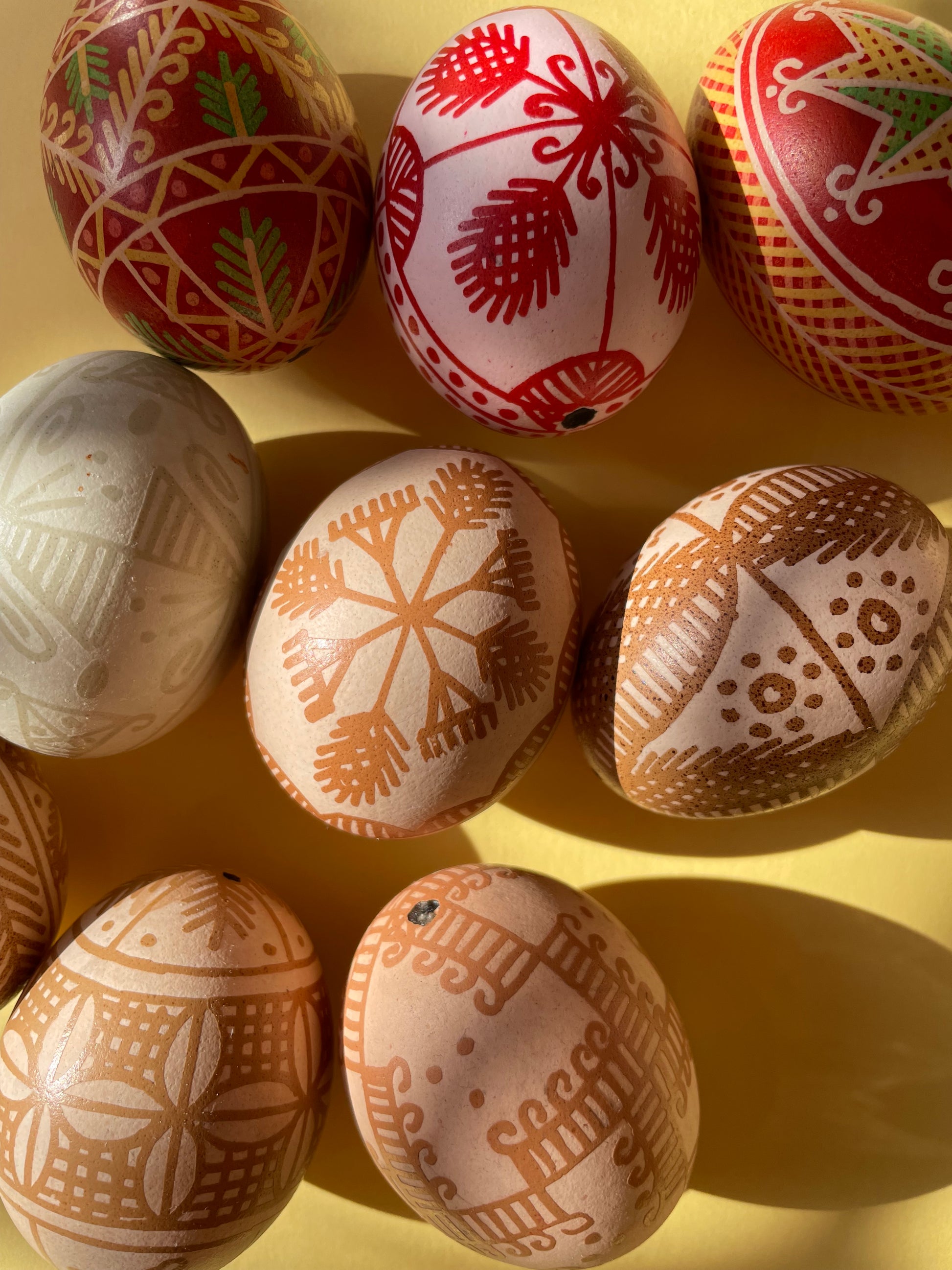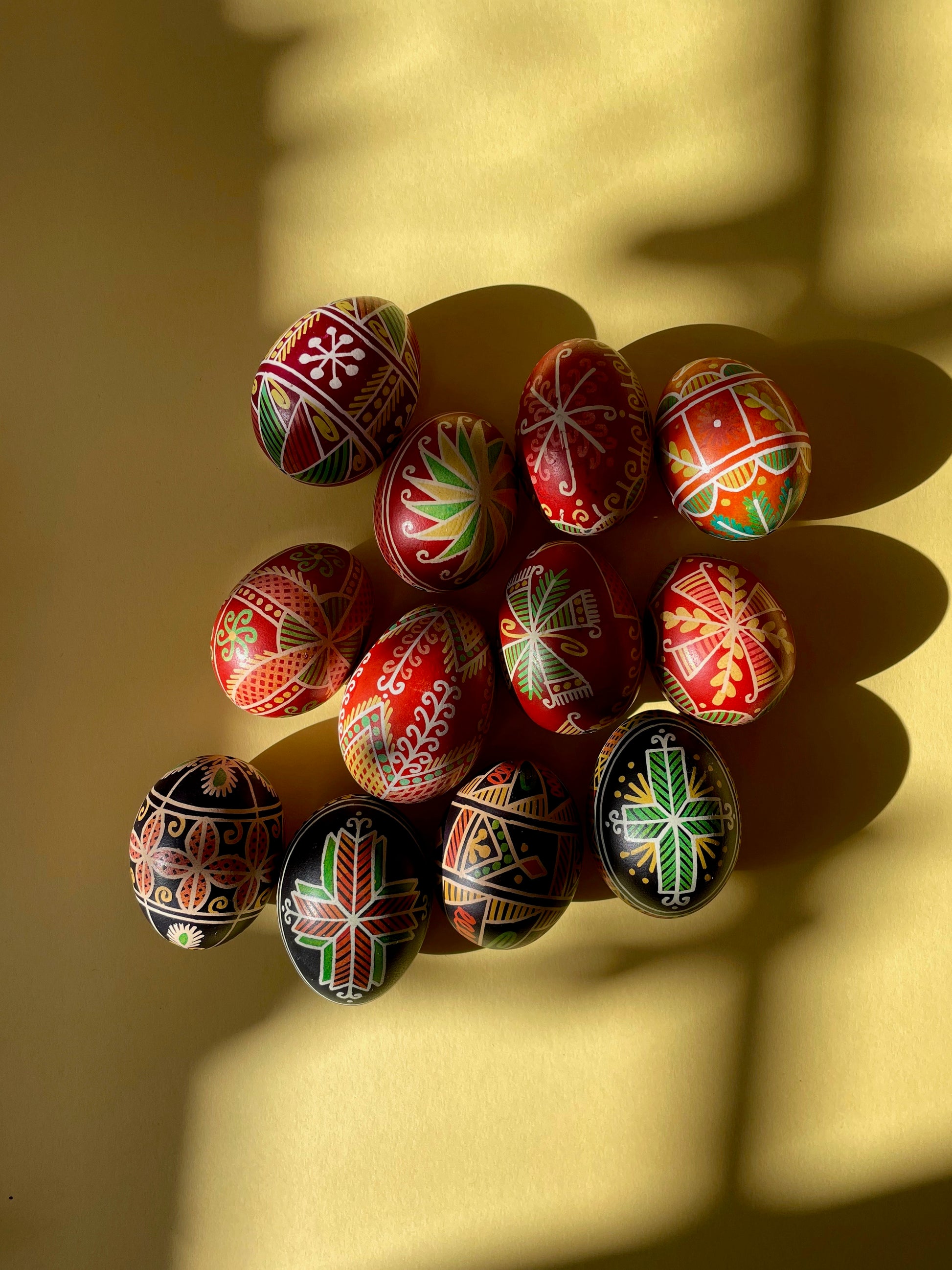 These pisanki were made by Michał in a "batik" technique - drawing on an eggshell with a natural beeswax and then dipping them into dyes.