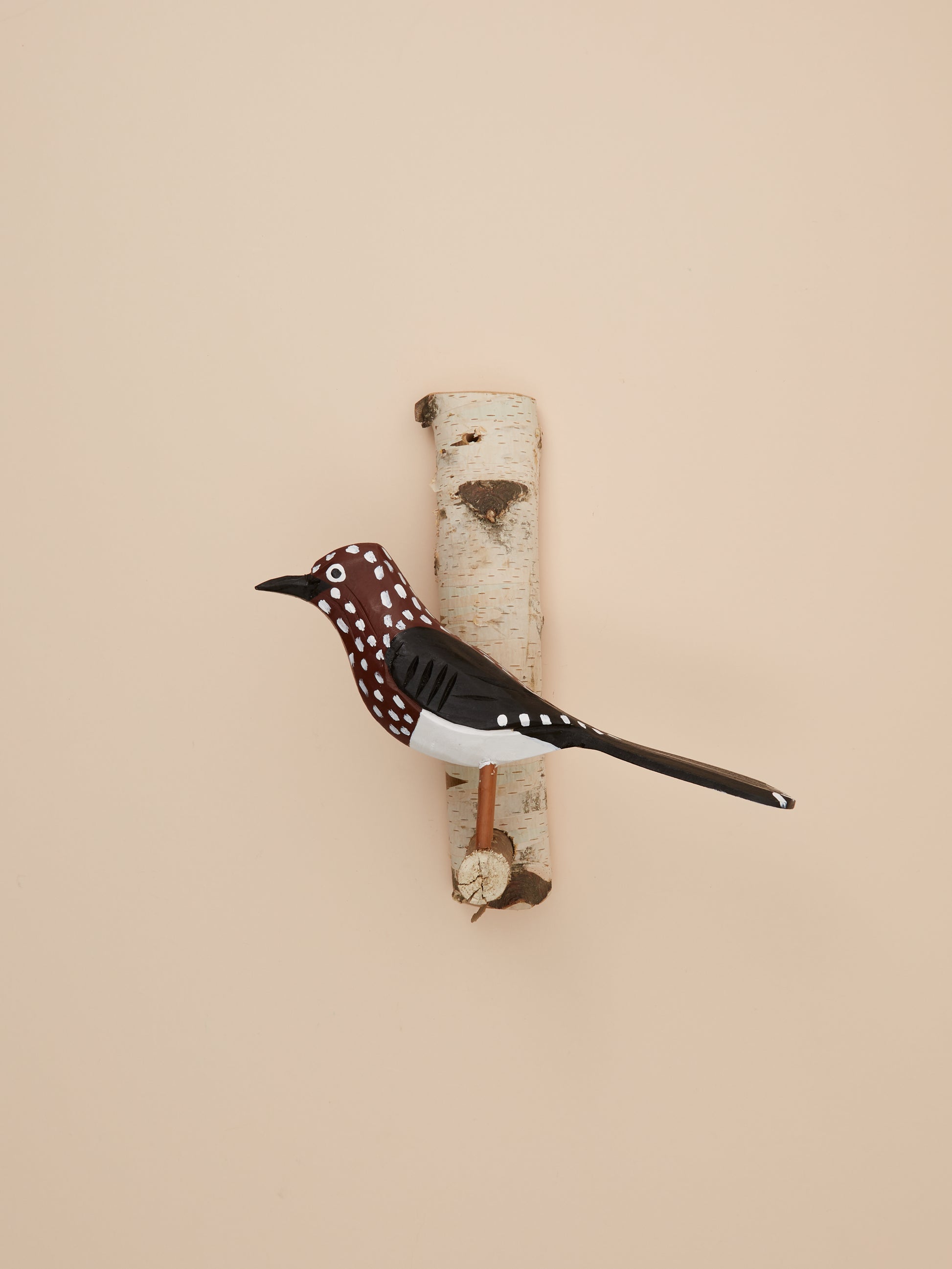 Beautiful spotted nutcracker on a branch, hand carved and hand painted in wood.