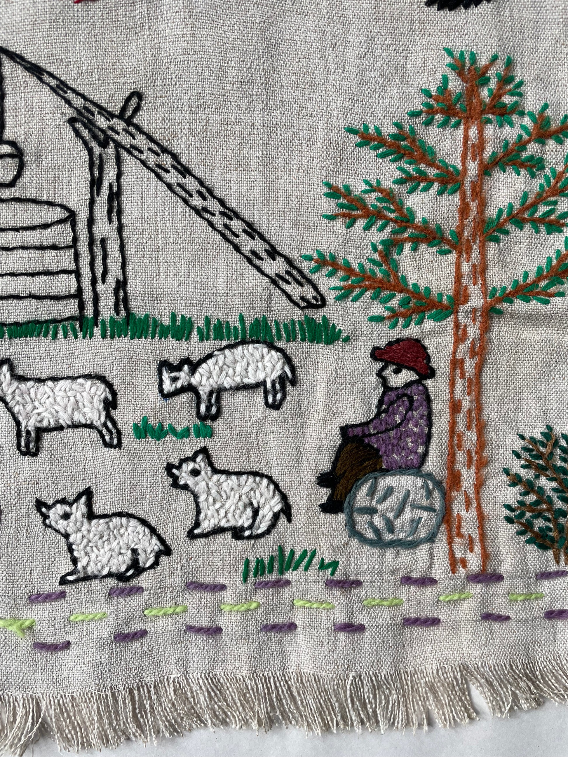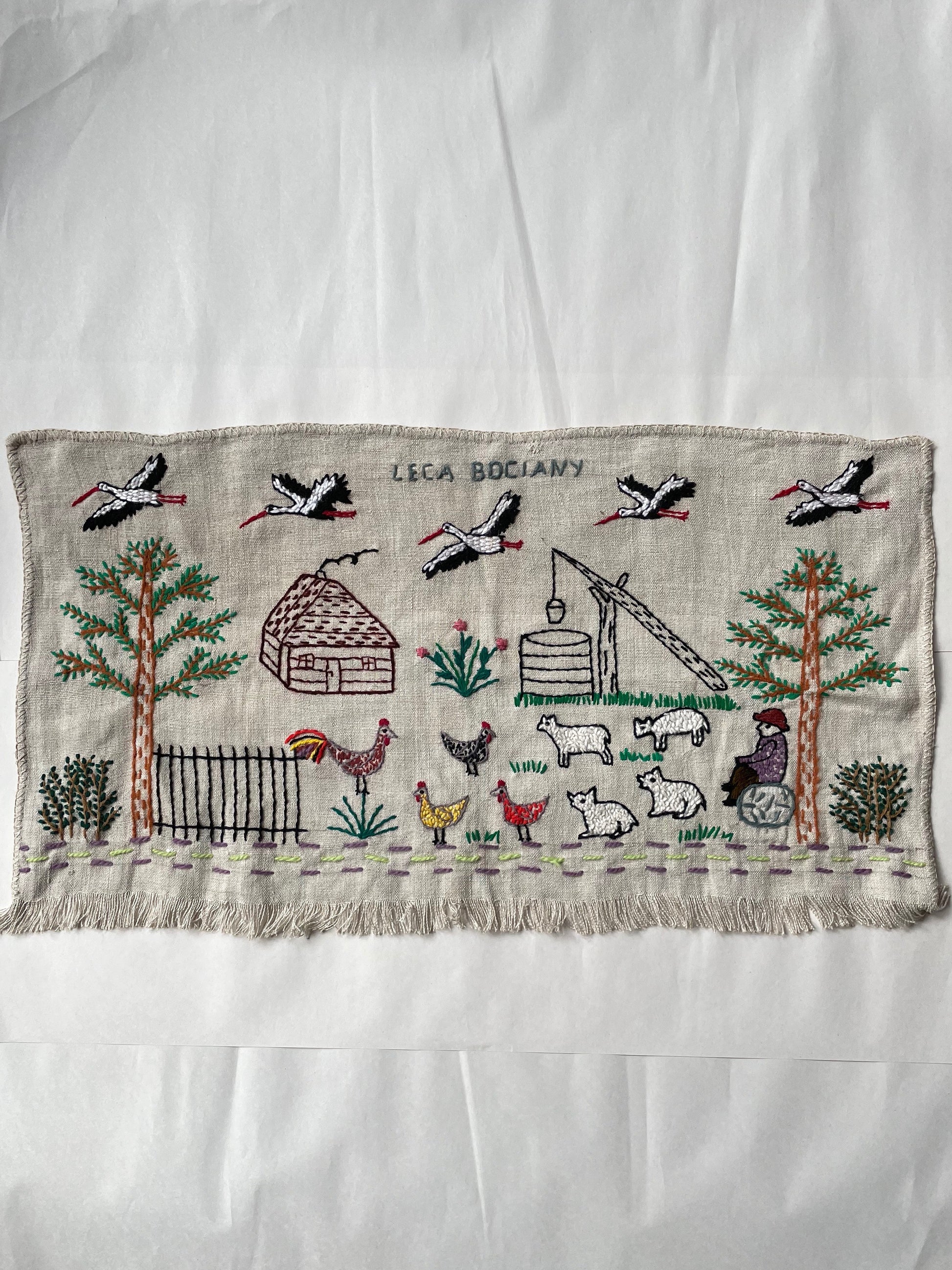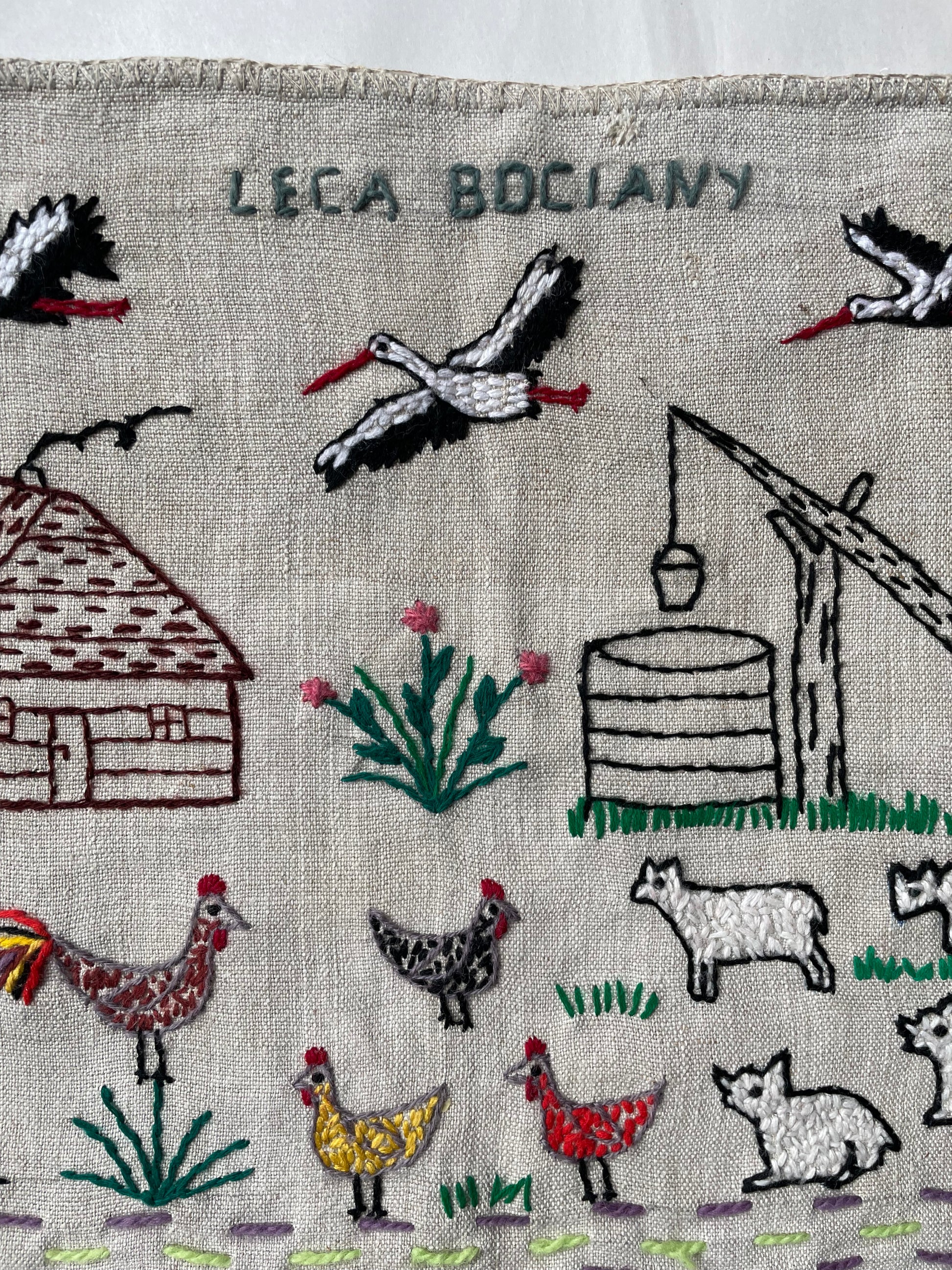 Lecą bociany (Flying storks) presents a lovely scene from the countryside. Shepherd sitting in front of his cottage, looking after his sheep and chickens with flying storks above. Look at this lovely hand embroidered water well! Such a dreamy scene.