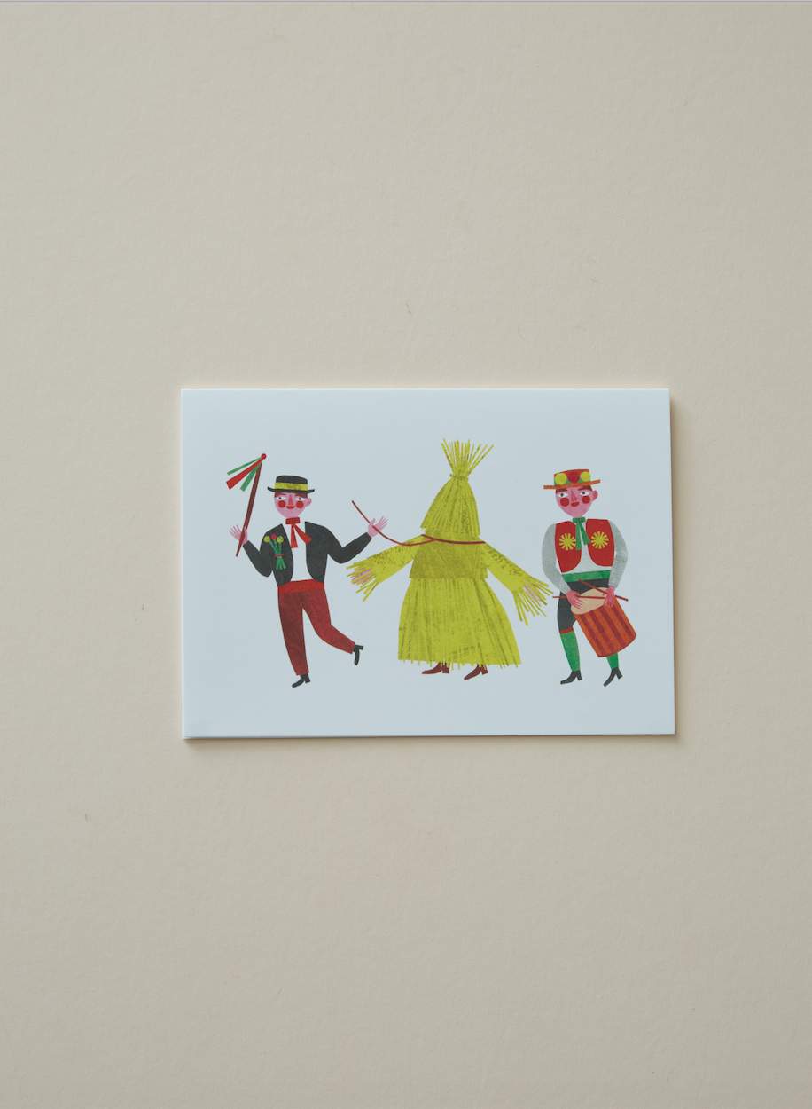 An A6 greeting card featuring a cut-paper collage image of Straw Bear by Marion Elliot.