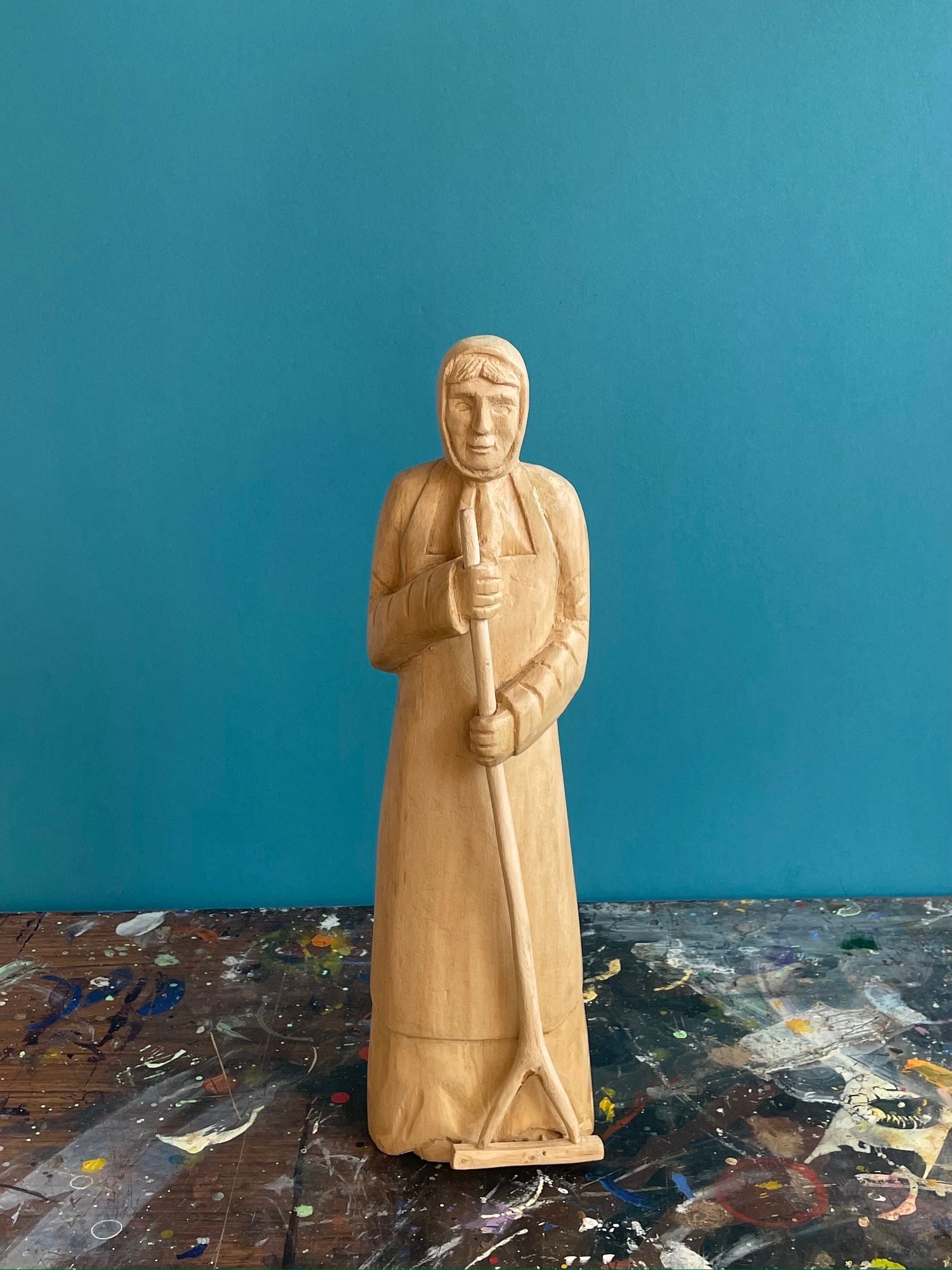 Unique sculpture depicting woman harvesting hay. Beautifully hand carved in wood by a folk artist Jan. We love that he even sculpted a hay rake!